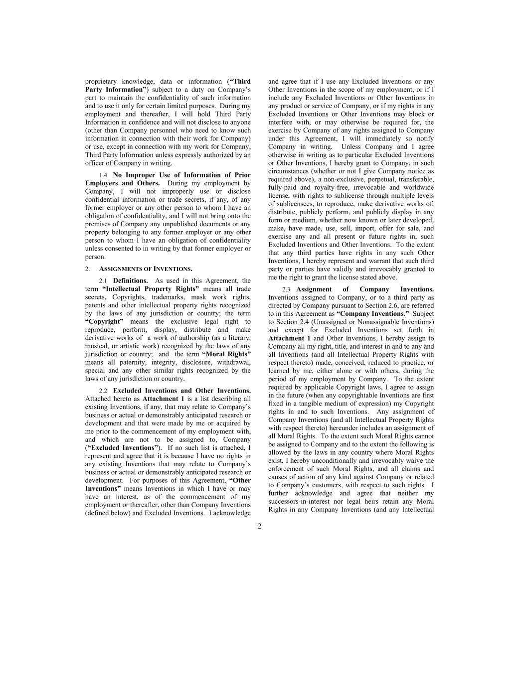 2 proprietary knowledge, data or information (“Third Party Information”) subject to a duty on Company’s part to maintain the confidentiality of such information and to use it only for certain limited purposes. During my employment and thereafter, I will hold Third Party Information in confidence and will not disclose to anyone (other than Company personnel who need to know such information in connection with their work for Company) or use, except in connection with my work for Company, Third Party Information unless expressly authorized by an officer of Company in writing. 1.4 No Improper Use of Information of Prior Employers and Others. During my employment by Company, I will not improperly use or disclose confidential information or trade secrets, if any, of any former employer or any other person to whom I have an obligation of confidentiality, and I will not bring onto the premises of Company any unpublished documents or any property belonging to any former employer or any other person to whom I have an obligation of confidentiality unless consented to in writing by that former employer or person. 2. ASSIGNMENTS OF INVENTIONS. 2.1 Definitions. As used in this Agreement, the term “Intellectual Property Rights” means all trade secrets, Copyrights, trademarks, mask work rights, patents and other intellectual property rights recognized by the laws of any jurisdiction or country; the term “Copyright” means the exclusive legal right to reproduce, perform, display, distribute and make derivative works of a work of authorship (as a literary, musical, or artistic work) recognized by the laws of any jurisdiction or country; and the term “Moral Rights” means all paternity, integrity, disclosure, withdrawal, special and any other similar rights recognized by the laws of any jurisdiction or country. 2.2 Excluded Inventions and Other Inventions. Attached hereto as Attachment 1 is a list describing all existing Inventions, if any, that may relate to Company’s business or actual or demonstrably anticipated research or development and that were made by me or acquired by me prior to the commencement of my employment with, and which are not to be assigned to, Company (“Excluded Inventions”). If no such list is attached, I represent and agree that it is because I have no rights in any existing Inventions that may relate to Company’s business or actual or demonstrably anticipated research or development. For purposes of this Agreement, “Other Inventions” means Inventions in which I have or may have an interest, as of the commencement of my employment or thereafter, other than Company Inventions (defined below) and Excluded Inventions. I acknowledge and agree that if I use any Excluded Inventions or any Other Inventions in the scope of my employment, or if I include any Excluded Inventions or Other Inventions in any product or service of Company, or if my rights in any Excluded Inventions or Other Inventions may block or interfere with, or may otherwise be required for, the exercise by Company of any rights assigned to Company under this Agreement, I will immediately so notify Company in writing. Unless Company and I agree otherwise in writing as to particular Excluded Inventions or Other Inventions, I hereby grant to Company, in such circumstances (whether or not I give Company notice as required above), a non-exclusive, perpetual, transferable, fully-paid and royalty-free, irrevocable and worldwide license, with rights to sublicense through multiple levels of sublicensees, to reproduce, make derivative works of, distribute, publicly perform, and publicly display in any form or medium, whether now known or later developed, make, have made, use, sell, import, offer for sale, and exercise any and all present or future rights in, such Excluded Inventions and Other Inventions. To the extent that any third parties have rights in any such Other Inventions, I hereby represent and warrant that such third party or parties have validly and irrevocably granted to me the right to grant the license stated above. 2.3 Assignment of Company Inventions. Inventions assigned to Company, or to a third party as directed by Company pursuant to Section 2.6, are referred to in this Agreement as “Company Inventions.” Subject to Section 2.4 (Unassigned or Nonassignable Inventions) and except for Excluded Inventions set forth in Attachment 1 and Other Inventions, I hereby assign to Company all my right, title, and interest in and to any and all Inventions (and all Intellectual Property Rights with respect thereto) made, conceived, reduced to practice, or learned by me, either alone or with others, during the period of my employment by Company. To the extent required by applicable Copyright laws, I agree to assign in the future (when any copyrightable Inventions are first fixed in a tangible medium of expression) my Copyright rights in and to such Inventions. Any assignment of Company Inventions (and all Intellectual Property Rights with respect thereto) hereunder includes an assignment of all Moral Rights. To the extent such Moral Rights cannot be assigned to Company and to the extent the following is allowed by the laws in any country where Moral Rights exist, I hereby unconditionally and irrevocably waive the enforcement of such Moral Rights, and all claims and causes of action of any kind against Company or related to Company’s customers, with respect to such rights. I further acknowledge and agree that neither my successors-in-interest nor legal heirs retain any Moral Rights in any Company Inventions (and any Intellectual