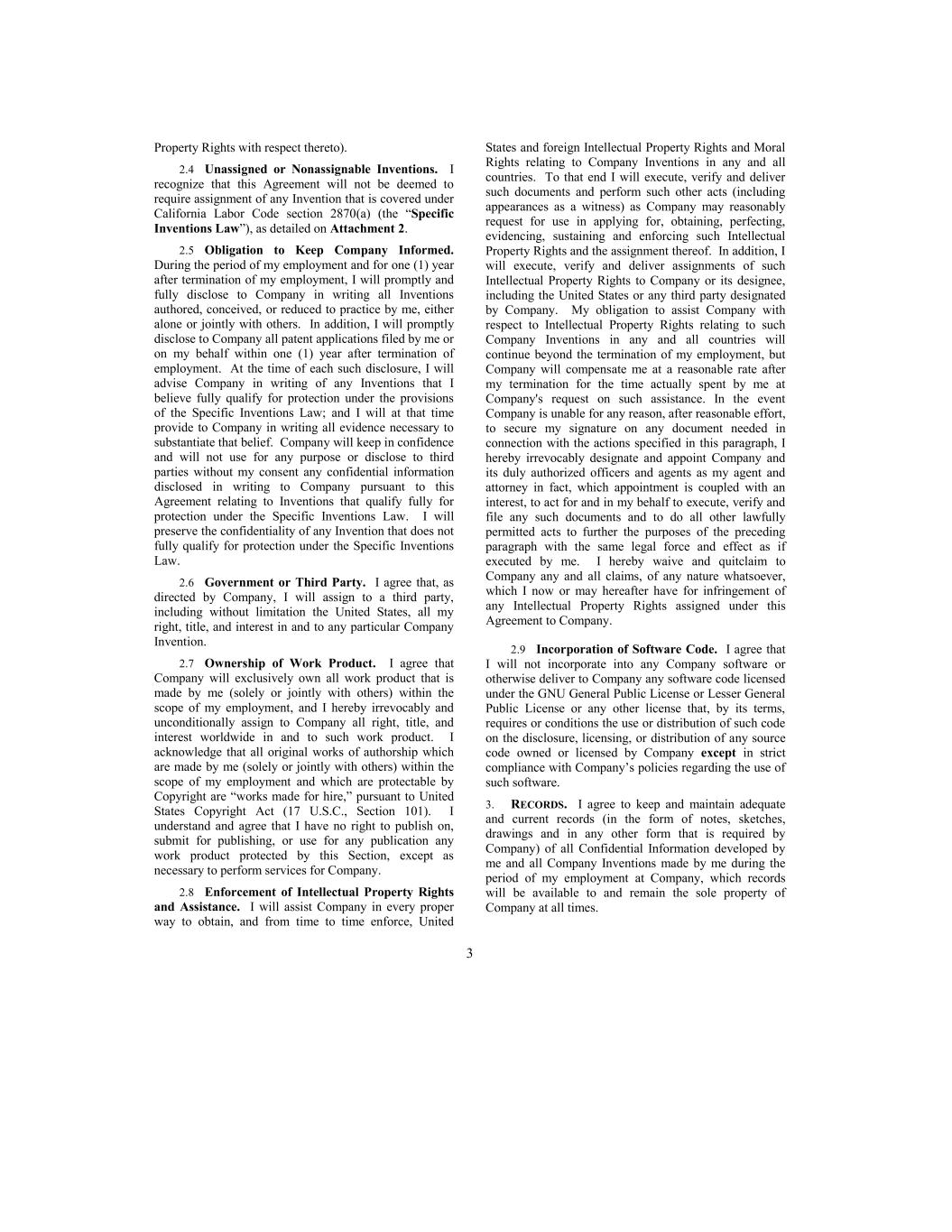 3 Property Rights with respect thereto). 2.4 Unassigned or Nonassignable Inventions. I recognize that this Agreement will not be deemed to require assignment of any Invention that is covered under California Labor Code section 2870(a) (the “Specific Inventions Law”), as detailed on Attachment 2. 2.5 Obligation to Keep Company Informed. During the period of my employment and for one (1) year after termination of my employment, I will promptly and fully disclose to Company in writing all Inventions authored, conceived, or reduced to practice by me, either alone or jointly with others. In addition, I will promptly disclose to Company all patent applications filed by me or on my behalf within one (1) year after termination of employment. At the time of each such disclosure, I will advise Company in writing of any Inventions that I believe fully qualify for protection under the provisions of the Specific Inventions Law; and I will at that time provide to Company in writing all evidence necessary to substantiate that belief. Company will keep in confidence and will not use for any purpose or disclose to third parties without my consent any confidential information disclosed in writing to Company pursuant to this Agreement relating to Inventions that qualify fully for protection under the Specific Inventions Law. I will preserve the confidentiality of any Invention that does not fully qualify for protection under the Specific Inventions Law. 2.6 Government or Third Party. I agree that, as directed by Company, I will assign to a third party, including without limitation the United States, all my right, title, and interest in and to any particular Company Invention. 2.7 Ownership of Work Product. I agree that Company will exclusively own all work product that is made by me (solely or jointly with others) within the scope of my employment, and I hereby irrevocably and unconditionally assign to Company all right, title, and interest worldwide in and to such work product. I acknowledge that all original works of authorship which are made by me (solely or jointly with others) within the scope of my employment and which are protectable by Copyright are “works made for hire,” pursuant to United States Copyright Act (17 U.S.C., Section 101). I understand and agree that I have no right to publish on, submit for publishing, or use for any publication any work product protected by this Section, except as necessary to perform services for Company. 2.8 Enforcement of Intellectual Property Rights and Assistance. I will assist Company in every proper way to obtain, and from time to time enforce, United States and foreign Intellectual Property Rights and Moral Rights relating to Company Inventions in any and all countries. To that end I will execute, verify and deliver such documents and perform such other acts (including appearances as a witness) as Company may reasonably request for use in applying for, obtaining, perfecting, evidencing, sustaining and enforcing such Intellectual Property Rights and the assignment thereof. In addition, I will execute, verify and deliver assignments of such Intellectual Property Rights to Company or its designee, including the United States or any third party designated by Company. My obligation to assist Company with respect to Intellectual Property Rights relating to such Company Inventions in any and all countries will continue beyond the termination of my employment, but Company will compensate me at a reasonable rate after my termination for the time actually spent by me at Company's request on such assistance. In the event Company is unable for any reason, after reasonable effort, to secure my signature on any document needed in connection with the actions specified in this paragraph, I hereby irrevocably designate and appoint Company and its duly authorized officers and agents as my agent and attorney in fact, which appointment is coupled with an interest, to act for and in my behalf to execute, verify and file any such documents and to do all other lawfully permitted acts to further the purposes of the preceding paragraph with the same legal force and effect as if executed by me. I hereby waive and quitclaim to Company any and all claims, of any nature whatsoever, which I now or may hereafter have for infringement of any Intellectual Property Rights assigned under this Agreement to Company. 2.9 Incorporation of Software Code. I agree that I will not incorporate into any Company software or otherwise deliver to Company any software code licensed under the GNU General Public License or Lesser General Public License or any other license that, by its terms, requires or conditions the use or distribution of such code on the disclosure, licensing, or distribution of any source code owned or licensed by Company except in strict compliance with Company’s policies regarding the use of such software. 3. RECORDS. I agree to keep and maintain adequate and current records (in the form of notes, sketches, drawings and in any other form that is required by Company) of all Confidential Information developed by me and all Company Inventions made by me during the period of my employment at Company, which records will be available to and remain the sole property of Company at all times.
