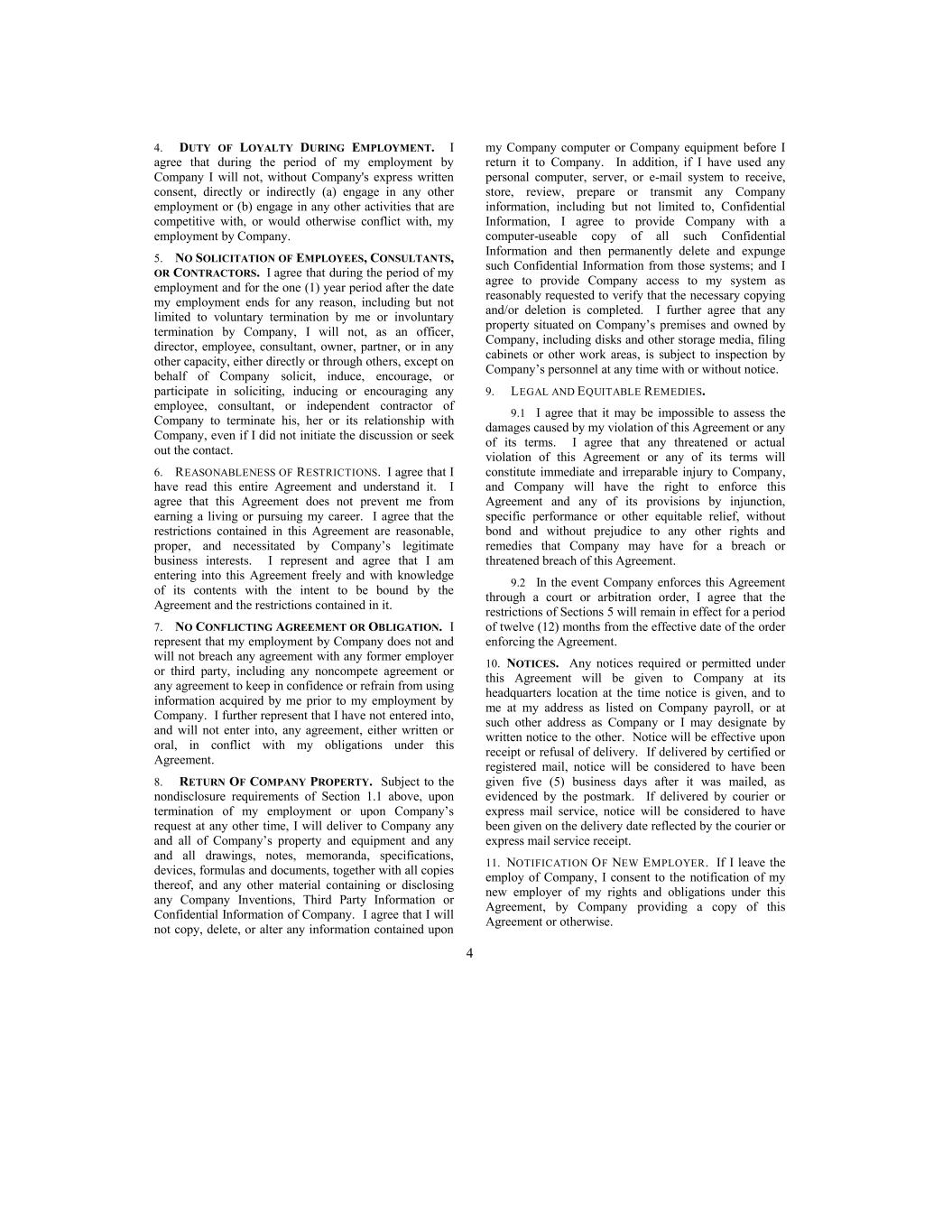 4 4. DUTY OF LOYALTY DURING EMPLOYMENT. I agree that during the period of my employment by Company I will not, without Company's express written consent, directly or indirectly (a) engage in any other employment or (b) engage in any other activities that are competitive with, or would otherwise conflict with, my employment by Company. 5. NO SOLICITATION OF EMPLOYEES, CONSULTANTS, OR CONTRACTORS. I agree that during the period of my employment and for the one (1) year period after the date my employment ends for any reason, including but not limited to voluntary termination by me or involuntary termination by Company, I will not, as an officer, director, employee, consultant, owner, partner, or in any other capacity, either directly or through others, except on behalf of Company solicit, induce, encourage, or participate in soliciting, inducing or encouraging any employee, consultant, or independent contractor of Company to terminate his, her or its relationship with Company, even if I did not initiate the discussion or seek out the contact. 6. REASONABLENESS OF RESTRICTIONS. I agree that I have read this entire Agreement and understand it. I agree that this Agreement does not prevent me from earning a living or pursuing my career. I agree that the restrictions contained in this Agreement are reasonable, proper, and necessitated by Company’s legitimate business interests. I represent and agree that I am entering into this Agreement freely and with knowledge of its contents with the intent to be bound by the Agreement and the restrictions contained in it. 7. NO CONFLICTING AGREEMENT OR OBLIGATION. I represent that my employment by Company does not and will not breach any agreement with any former employer or third party, including any noncompete agreement or any agreement to keep in confidence or refrain from using information acquired by me prior to my employment by Company. I further represent that I have not entered into, and will not enter into, any agreement, either written or oral, in conflict with my obligations under this Agreement. 8. RETURN OF COMPANY PROPERTY. Subject to the nondisclosure requirements of Section 1.1 above, upon termination of my employment or upon Company’s request at any other time, I will deliver to Company any and all of Company’s property and equipment and any and all drawings, notes, memoranda, specifications, devices, formulas and documents, together with all copies thereof, and any other material containing or disclosing any Company Inventions, Third Party Information or Confidential Information of Company. I agree that I will not copy, delete, or alter any information contained upon my Company computer or Company equipment before I return it to Company. In addition, if I have used any personal computer, server, or e-mail system to receive, store, review, prepare or transmit any Company information, including but not limited to, Confidential Information, I agree to provide Company with a computer-useable copy of all such Confidential Information and then permanently delete and expunge such Confidential Information from those systems; and I agree to provide Company access to my system as reasonably requested to verify that the necessary copying and/or deletion is completed. I further agree that any property situated on Company’s premises and owned by Company, including disks and other storage media, filing cabinets or other work areas, is subject to inspection by Company’s personnel at any time with or without notice. 9. LEGAL AND EQUITABLE REMEDIES. 9.1 I agree that it may be impossible to assess the damages caused by my violation of this Agreement or any of its terms. I agree that any threatened or actual violation of this Agreement or any of its terms will constitute immediate and irreparable injury to Company, and Company will have the right to enforce this Agreement and any of its provisions by injunction, specific performance or other equitable relief, without bond and without prejudice to any other rights and remedies that Company may have for a breach or threatened breach of this Agreement. 9.2 In the event Company enforces this Agreement through a court or arbitration order, I agree that the restrictions of Sections 5 will remain in effect for a period of twelve (12) months from the effective date of the order enforcing the Agreement. 10. NOTICES. Any notices required or permitted under this Agreement will be given to Company at its headquarters location at the time notice is given, and to me at my address as listed on Company payroll, or at such other address as Company or I may designate by written notice to the other. Notice will be effective upon receipt or refusal of delivery. If delivered by certified or registered mail, notice will be considered to have been given five (5) business days after it was mailed, as evidenced by the postmark. If delivered by courier or express mail service, notice will be considered to have been given on the delivery date reflected by the courier or express mail service receipt. 11. NOTIFICATION OF NEW EMPLOYER. If I leave the employ of Company, I consent to the notification of my new employer of my rights and obligations under this Agreement, by Company providing a copy of this Agreement or otherwise.