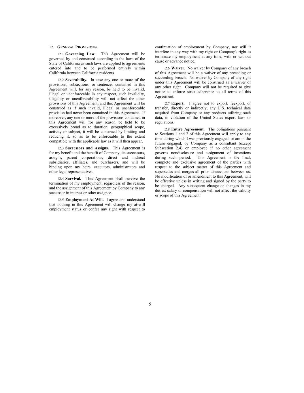 5 12. GENERAL PROVISIONS. 12.1 Governing Law. This Agreement will be governed by and construed according to the laws of the State of California as such laws are applied to agreements entered into and to be performed entirely within California between California residents. 12.2 Severability. In case any one or more of the provisions, subsections, or sentences contained in this Agreement will, for any reason, be held to be invalid, illegal or unenforceable in any respect, such invalidity, illegality or unenforceability will not affect the other provisions of this Agreement, and this Agreement will be construed as if such invalid, illegal or unenforceable provision had never been contained in this Agreement. If moreover, any one or more of the provisions contained in this Agreement will for any reason be held to be excessively broad as to duration, geographical scope, activity or subject, it will be construed by limiting and reducing it, so as to be enforceable to the extent compatible with the applicable law as it will then appear. 12.3 Successors and Assigns. This Agreement is for my benefit and the benefit of Company, its successors, assigns, parent corporations, direct and indirect subsidiaries, affiliates, and purchasers, and will be binding upon my heirs, executors, administrators and other legal representatives. 12.4 Survival. This Agreement shall survive the termination of my employment, regardless of the reason, and the assignment of this Agreement by Company to any successor in interest or other assignee. 12.5 Employment At-Will. I agree and understand that nothing in this Agreement will change my at-will employment status or confer any right with respect to continuation of employment by Company, nor will it interfere in any way with my right or Company's right to terminate my employment at any time, with or without cause or advance notice. 12.6 Waiver. No waiver by Company of any breach of this Agreement will be a waiver of any preceding or succeeding breach. No waiver by Company of any right under this Agreement will be construed as a waiver of any other right. Company will not be required to give notice to enforce strict adherence to all terms of this Agreement. 12.7 Export. I agree not to export, reexport, or transfer, directly or indirectly, any U.S. technical data acquired from Company or any products utilizing such data, in violation of the United States export laws or regulations. 12.8 Entire Agreement. The obligations pursuant to Sections 1 and 2 of this Agreement will apply to any time during which I was previously engaged, or am in the future engaged, by Company as a consultant (except Subsection 2.4) or employee if no other agreement governs nondisclosure and assignment of inventions during such period. This Agreement is the final, complete and exclusive agreement of the parties with respect to the subject matter of this Agreement and supersedes and merges all prior discussions between us. No modification of or amendment to this Agreement, will be effective unless in writing and signed by the party to be charged. Any subsequent change or changes in my duties, salary or compensation will not affect the validity or scope of this Agreement.