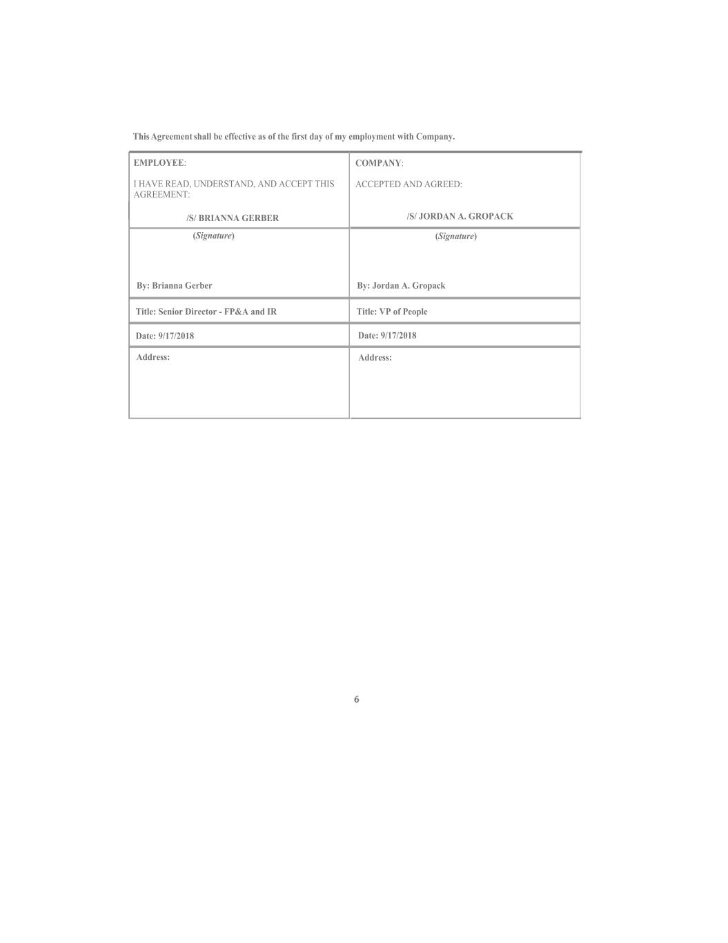 This Agreement shall be effective as of the first day of my employment with Company. 6 COMPANY: ACCEPTED AND AGREED: EMPLOYEE: I HAVE READ, UNDERSTAND, AND ACCEPT THIS AGREEMENT: /S/ BRIANNA GERBER (Signature) (Signature) /S/ JORDAN A. GROPACK By: Brianna Gerber Title: Senior Director - FP&A and IR Date: 9/17/2018 Address: By: Jordan A. Gropack Title: VP of People Date: 9/17/2018 Address: