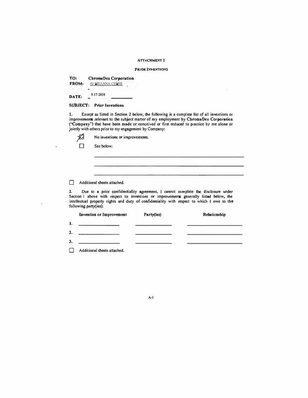 ATfACHM€NT 1 PRJOR INVENTIONS TO: Cbroma.Dex Corporal!ion FROM: /S/ BRIANNA GEBER DA TE: 9-17-2018 SUBJECT: Prior [nnntions 1. Except as listed in Section 2 below, the following is a complete list of aJI inventions or improvements relevant to the subject matter of my employment by Cl:tromaDex CorponttOa ('X:ompany") that have been made or conceived or first reduced to practice by me alone or jointly with others prior to myengagemenl by Company: � No inventions or improvements. D Sec below: 0 Additional sheets attached. 1, Due to a prior eonfidentlality agreement, I cannot complete the disclosure under Section I above with respect ro inventions or improvemenrs generally listed below, the intellectual property rights and duty of confidentiality with respect to whic.h I owe to the­ following par1y(ie$): I. 2. 3. lanntioa or Improvement 0 Additional sheets attached. Party(! .. ) Rela1ionsb1p