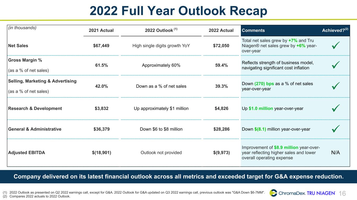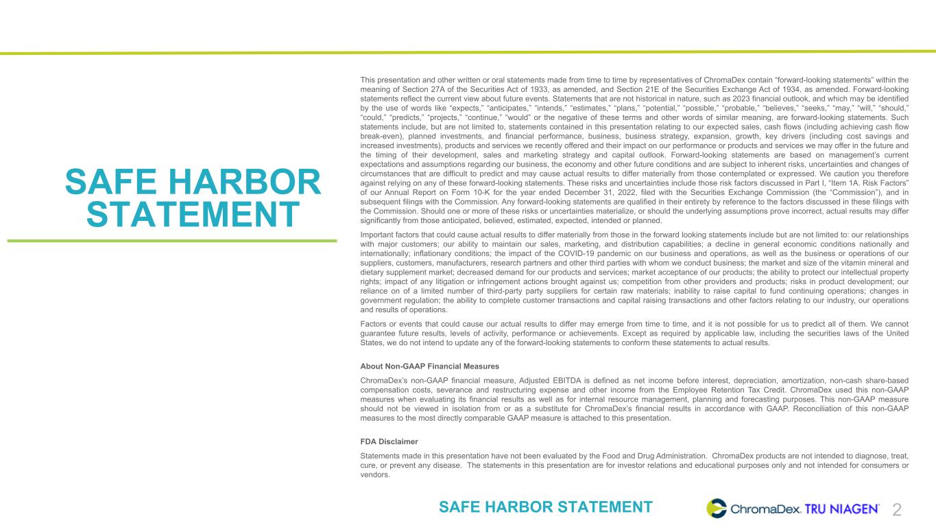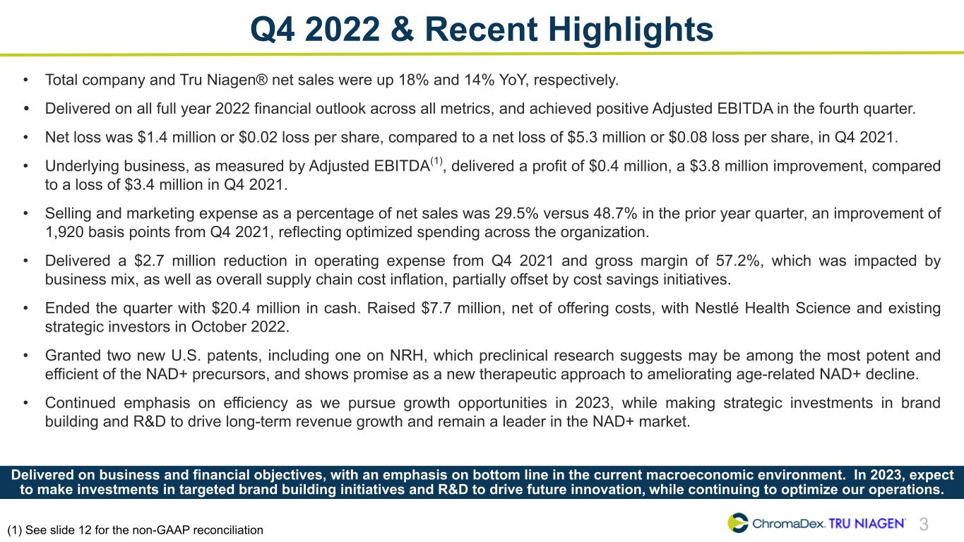 2 SAFE HARBOR STATEMENT This presentation and other written or oral statements made from time to time by representatives of ChromaDex contain “forward-looking statements” within the meaning of Section 27A of the Securities Act of 1933, as amended, and Section 21E of the Securities Exchange Act of 1934, as amended. Forward-looking statements reflect the current view about future events. Statements that are not historical in nature, such as 2023 financial outlook, and which may be identified by the use of words like “expects,” “anticipates,” “intends,” “estimates,” “plans,” “potential,” “possible,” “probable,” “believes,” “seeks,” “may,” “will,” “should,” “could,” “predicts,” “projects,” “continue,” “would” or the negative of these terms and other words of similar meaning, are forward-looking statements. Such statements include, but are not limited to, statements contained in this presentation relating to our expected sales, cash flows (including achieving cash flow break-even), planned investments, and financial performance, business, business strategy, expansion, growth, key drivers (including cost savings and increased investments), products and services we recently offered and their impact on our performance or products and services we may offer in the future and the timing of their development, sales and marketing strategy and capital outlook. Forward-looking statements are based on management’s current expectations and assumptions regarding our business, the economy and other future conditions and are subject to inherent risks, uncertainties and changes of circumstances that are difficult to predict and may cause actual results to differ materially from those contemplated or expressed. We caution you therefore against relying on any of these forward-looking statements. These risks and uncertainties include those risk factors discussed in Part I, “Item 1A. Risk Factors” of our Annual Report on Form 10-K for the year ended December 31, 2022, filed with the Securities Exchange Commission (the “Commission”), and in subsequent filings with the Commission. Any forward-looking statements are qualified in their entirety by reference to the factors discussed in these filings with the Commission. Should one or more of these risks or uncertainties materialize, or should the underlying assumptions prove incorrect, actual results may differ significantly from those anticipated, believed, estimated, expected, intended or planned. Important factors that could cause actual results to differ materially from those in the forward looking statements include but are not limited to: our relationships with major customers; our ability to maintain our sales, marketing, and distribution capabilities; a decline in general economic conditions nationally and internationally; inflationary conditions; the impact of the COVID-19 pandemic on our business and operations, as well as the business or operations of our suppliers, customers, manufacturers, research partners and other third parties with whom we conduct business; the market and size of the vitamin mineral and dietary supplement market; decreased demand for our products and services; market acceptance of our products; the ability to protect our intellectual property rights; impact of any litigation or infringement actions brought against us; competition from other providers and products; risks in product development; our reliance on of a limited number of third-party party suppliers for certain raw materials; inability to raise capital to fund continuing operations; changes in government regulation; the ability to complete customer transactions and capital raising transactions and other factors relating to our industry, our operations and results of operations. Factors or events that could cause our actual results to differ may emerge from time to time, and it is not possible for us to predict all of them. We cannot guarantee future results, levels of activity, performance or achievements. Except as required by applicable law, including the securities laws of the United States, we do not intend to update any of the forward-looking statements to conform these statements to actual results. About Non-GAAP Financial Measures ChromaDex’s non-GAAP financial measure, Adjusted EBITDA is defined as net income before interest, depreciation, amortization, non-cash share-based compensation costs, severance and restructuring expense and other income from the Employee Retention Tax Credit. ChromaDex used this non-GAAP measures when evaluating its financial results as well as for internal resource management, planning and forecasting purposes. This non-GAAP measure should not be viewed in isolation from or as a substitute for ChromaDex’s financial results in accordance with GAAP. Reconciliation of this non-GAAP measures to the most directly comparable GAAP measure is attached to this presentation. FDA Disclaimer Statements made in this presentation have not been evaluated by the Food and Drug Administration. ChromaDex products are not intended to diagnose, treat, cure, or prevent any disease. The statements in this presentation are for investor relations and educational purposes only and not intended for consumers or vendors. SAFE HARBOR STATEMENT