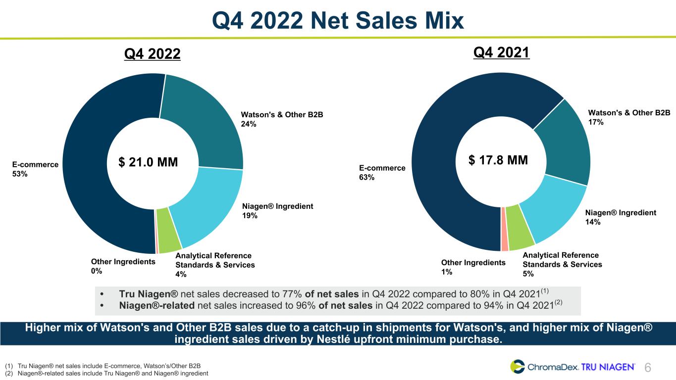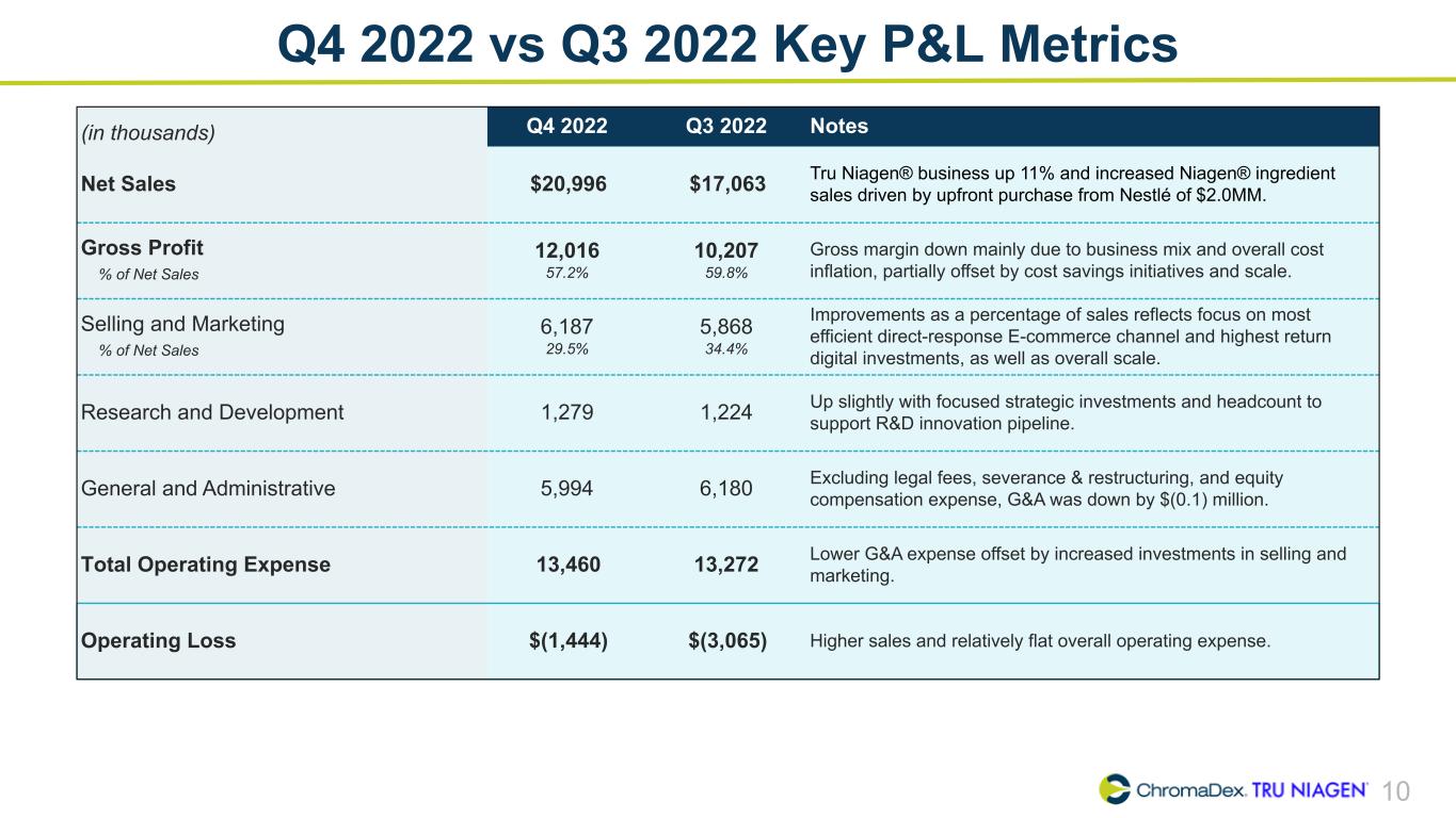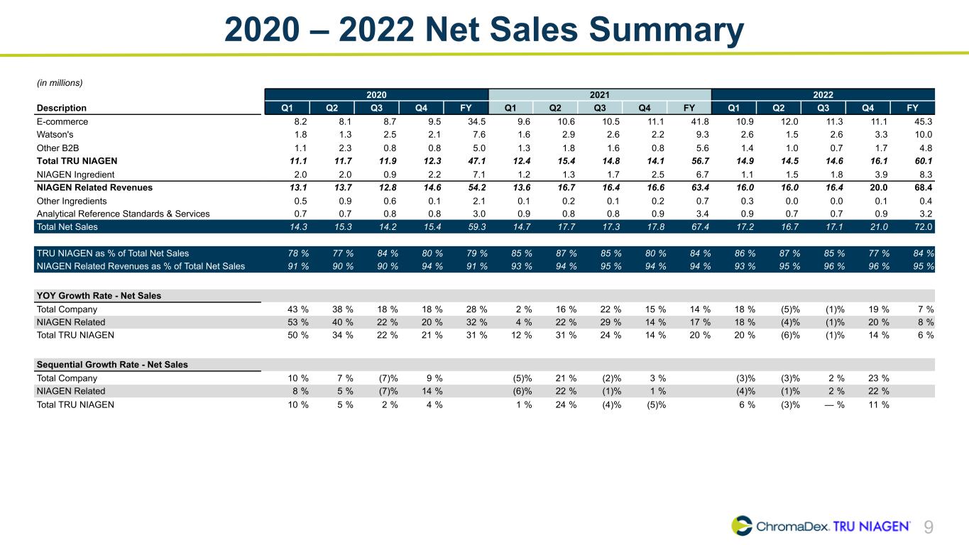 9 2020 – 2022 Net Sales Summary (in millions) 2020 2021 2022 Description Q1 Q2 Q3 Q4 FY Q1 Q2 Q3 Q4 FY Q1 Q2 Q3 Q4 FY E-commerce 8.2 8.1 8.7 9.5 34.5 9.6 10.6 10.5 11.1 41.8 10.9 12.0 11.3 11.1 45.3 Watson's 1.8 1.3 2.5 2.1 7.6 1.6 2.9 2.6 2.2 9.3 2.6 1.5 2.6 3.3 10.0 Other B2B 1.1 2.3 0.8 0.8 5.0 1.3 1.8 1.6 0.8 5.6 1.4 1.0 0.7 1.7 4.8 Total TRU NIAGEN 11.1 11.7 11.9 12.3 47.1 12.4 15.4 14.8 14.1 56.7 14.9 14.5 14.6 16.1 60.1 NIAGEN Ingredient 2.0 2.0 0.9 2.2 7.1 1.2 1.3 1.7 2.5 6.7 1.1 1.5 1.8 3.9 8.3 NIAGEN Related Revenues 13.1 13.7 12.8 14.6 54.2 13.6 16.7 16.4 16.6 63.4 16.0 16.0 16.4 20.0 68.4 Other Ingredients 0.5 0.9 0.6 0.1 2.1 0.1 0.2 0.1 0.2 0.7 0.3 0.0 0.0 0.1 0.4 Analytical Reference Standards & Services 0.7 0.7 0.8 0.8 3.0 0.9 0.8 0.8 0.9 3.4 0.9 0.7 0.7 0.9 3.2 Total Net Sales 14.3 15.3 14.2 15.4 59.3 14.7 17.7 17.3 17.8 67.4 17.2 16.7 17.1 21.0 72.0 TRU NIAGEN as % of Total Net Sales 78 % 77 % 84 % 80 % 79 % 85 % 87 % 85 % 80 % 84 % 86 % 87 % 85 % 77 % 84 % NIAGEN Related Revenues as % of Total Net Sales 91 % 90 % 90 % 94 % 91 % 93 % 94 % 95 % 94 % 94 % 93 % 95 % 96 % 96 % 95 % YOY Growth Rate - Net Sales Total Company 43 % 38 % 18 % 18 % 28 % 2 % 16 % 22 % 15 % 14 % 18 % (5) % (1) % 19 % 7 % NIAGEN Related 53 % 40 % 22 % 20 % 32 % 4 % 22 % 29 % 14 % 17 % 18 % (4) % (1) % 20 % 8 % Total TRU NIAGEN 50 % 34 % 22 % 21 % 31 % 12 % 31 % 24 % 14 % 20 % 20 % (6) % (1) % 14 % 6 % Sequential Growth Rate - Net Sales Total Company 10 % 7 % (7) % 9 % (5) % 21 % (2) % 3 % (3) % (3) % 2 % 23 % NIAGEN Related 8 % 5 % (7) % 14 % (6) % 22 % (1) % 1 % (4) % (1) % 2 % 22 % Total TRU NIAGEN 10 % 5 % 2 % 4 % 1 % 24 % (4) % (5) % 6 % (3) % — % 11 %