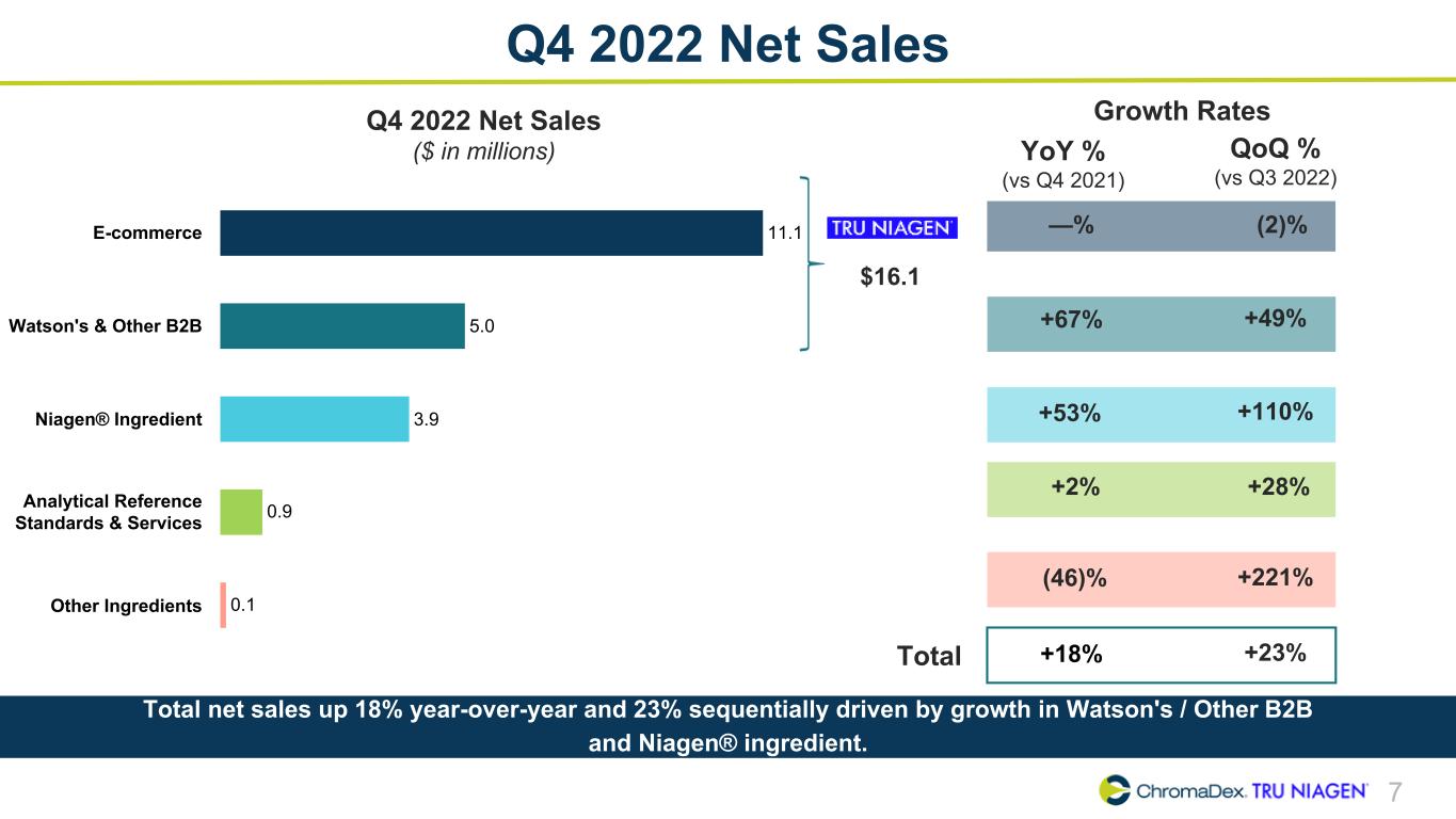 6 Q4 2022 Net Sales Mix E-commerce 63% Watson's & Other B2B 17% Niagen® Ingredient 14% Analytical Reference Standards & Services 5% Other Ingredients 1% $ 17.8 MM Q4 2021Q4 2022 • Tru Niagen® net sales decreased to 77% of net sales in Q4 2022 compared to 80% in Q4 2021(1) • Niagen®-related net sales increased to 96% of net sales in Q4 2022 compared to 94% in Q4 2021(2) E-commerce 53% Watson's & Other B2B 24% Niagen® Ingredient 19% Analytical Reference Standards & Services 4% Other Ingredients 0% $ 21.0 MM Higher mix of Watson's and Other B2B sales due to a catch-up in shipments for Watson's, and higher mix of Niagen® ingredient sales driven by Nestlé upfront minimum purchase. (1) Tru Niagen® net sales include E-commerce, Watson’s/Other B2B (2) Niagen®-related sales include Tru Niagen® and Niagen® ingredient