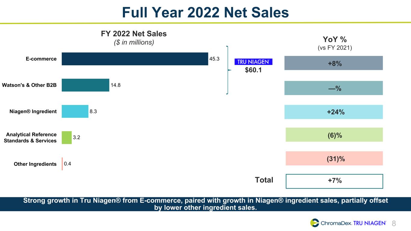 7 Q4 2022 Net Sales Q4 2022 Net Sales ($ in millions) $16.1 11.1 5.0 3.9 0.9 0.1 E-commerce Watson's & Other B2B Niagen® Ingredient Analytical Reference Standards & Services Other Ingredients Total net sales up 18% year-over-year and 23% sequentially driven by growth in Watson's / Other B2B and Niagen® ingredient. Growth Rates YoY % (vs Q4 2021) QoQ % (vs Q3 2022) —% (2)% +67% +49% +53% +110% +2% +28% (46)% +221% +18% +23%Total