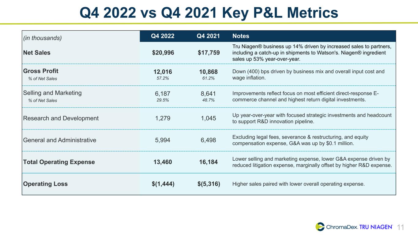 10 Q4 2022 vs Q3 2022 Key P&L Metrics (in thousands) Q4 2022 Q3 2022 Notes Net Sales $20,996 $17,063 Tru Niagen® business up 11% and increased Niagen® ingredient sales driven by upfront purchase from Nestlé of $2.0MM. Gross Profit % of Net Sales 12,016 57.2% 10,207 59.8% Gross margin down mainly due to business mix and overall cost inflation, partially offset by cost savings initiatives and scale. Selling and Marketing % of Net Sales 6,187 29.5% 5,868 34.4% Improvements as a percentage of sales reflects focus on most efficient direct-response E-commerce channel and highest return digital investments, as well as overall scale. Research and Development 1,279 1,224 Up slightly with focused strategic investments and headcount to support R&D innovation pipeline. General and Administrative 5,994 6,180 Excluding legal fees, severance & restructuring, and equity compensation expense, G&A was down by $(0.1) million. Total Operating Expense 13,460 13,272 Lower G&A expense offset by increased investments in selling and marketing. Operating Loss $(1,444) $(3,065) Higher sales and relatively flat overall operating expense.