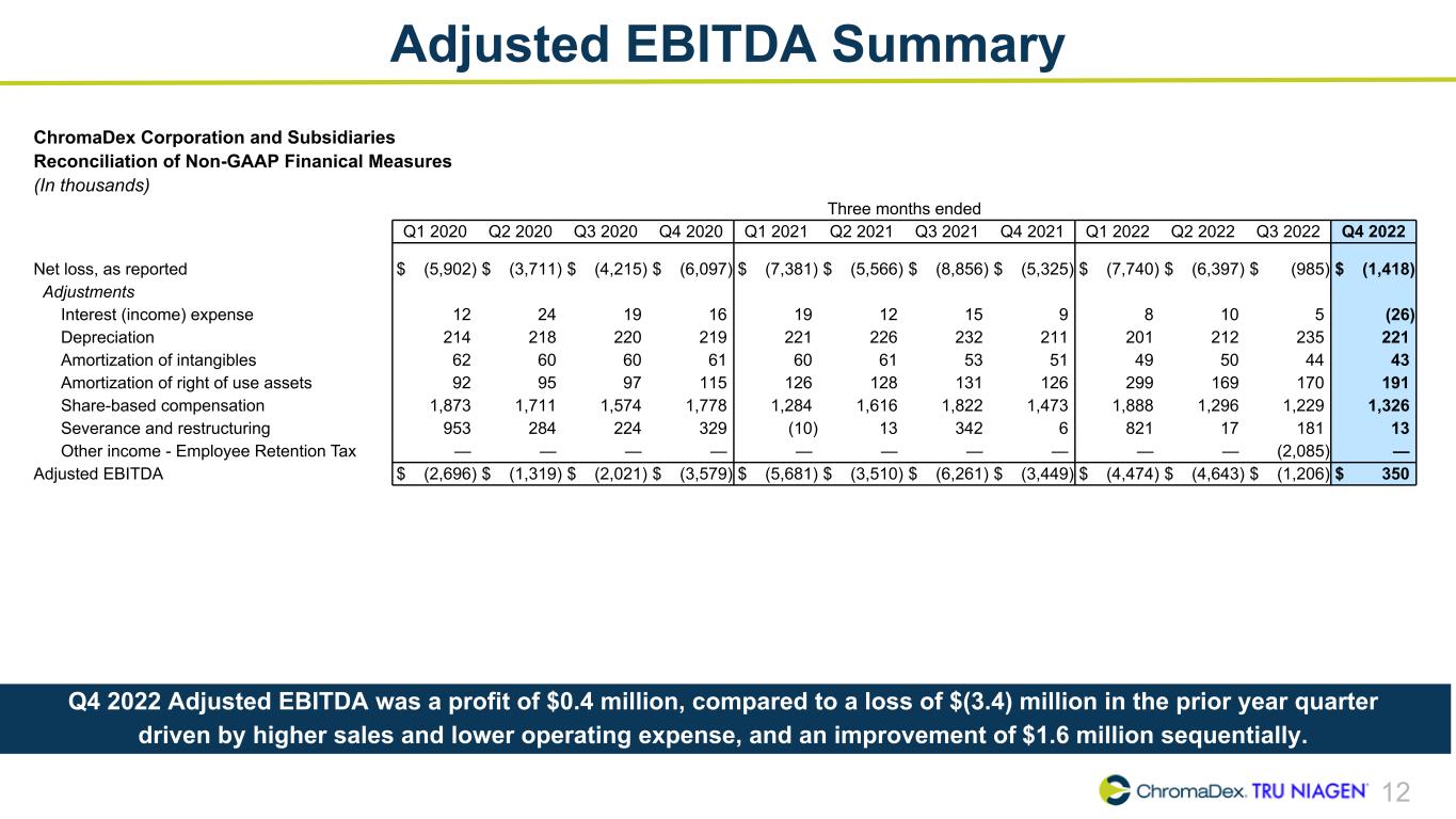 11 Q4 2022 vs Q4 2021 Key P&L Metrics (in thousands) Q4 2022 Q4 2021 Notes Net Sales $20,996 $17,759 Tru Niagen® business up 14% driven by increased sales to partners, including a catch-up in shipments to Watson's. Niagen® ingredient sales up 53% year-over-year. Gross Profit % of Net Sales 12,016 57.2% 10,868 61.2% Down (400) bps driven by business mix and overall input cost and wage inflation. Selling and Marketing % of Net Sales 6,187 29.5% 8,641 48.7% Improvements reflect focus on most efficient direct-response E- commerce channel and highest return digital investments. Research and Development 1,279 1,045 Up year-over-year with focused strategic investments and headcount to support R&D innovation pipeline. General and Administrative 5,994 6,498 Excluding legal fees, severance & restructuring, and equity compensation expense, G&A was up by $0.1 million. Total Operating Expense 13,460 16,184 Lower selling and marketing expense, lower G&A expense driven by reduced litigation expense, marginally offset by higher R&D expense. Operating Loss $(1,444) $(5,316) Higher sales paired with lower overall operating expense.