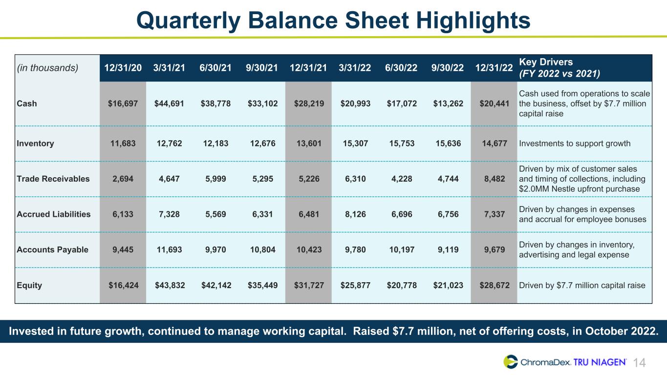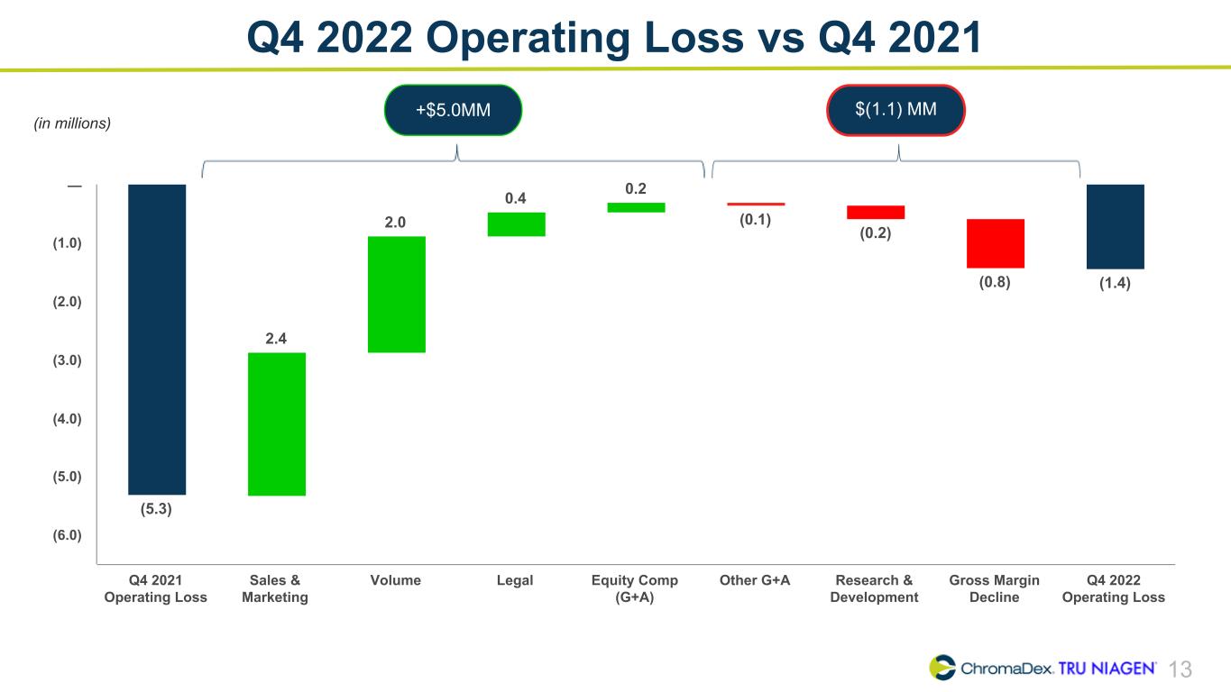 12 Adjusted EBITDA Summary ChromaDex Corporation and Subsidiaries Reconciliation of Non-GAAP Finanical Measures (In thousands) Three months ended Q1 2020 Q2 2020 Q3 2020 Q4 2020 Q1 2021 Q2 2021 Q3 2021 Q4 2021 Q1 2022 Q2 2022 Q3 2022 Q4 2022 Net loss, as reported $ (5,902) $ (3,711) $ (4,215) $ (6,097) $ (7,381) $ (5,566) $ (8,856) $ (5,325) $ (7,740) $ (6,397) $ (985) $ (1,418) Adjustments Interest (income) expense 12 24 19 16 19 12 15 9 8 10 5 (26) Depreciation 214 218 220 219 221 226 232 211 201 212 235 221 Amortization of intangibles 62 60 60 61 60 61 53 51 49 50 44 43 Amortization of right of use assets 92 95 97 115 126 128 131 126 299 169 170 191 Share-based compensation 1,873 1,711 1,574 1,778 1,284 1,616 1,822 1,473 1,888 1,296 1,229 1,326 Severance and restructuring 953 284 224 329 (10) 13 342 6 821 17 181 13 Other income - Employee Retention Tax — — — — — — — — — — (2,085) — Adjusted EBITDA $ (2,696) $ (1,319) $ (2,021) $ (3,579) $ (5,681) $ (3,510) $ (6,261) $ (3,449) $ (4,474) $ (4,643) $ (1,206) $ 350 Q4 2022 Adjusted EBITDA was a profit of $0.4 million, compared to a loss of $(3.4) million in the prior year quarter driven by higher sales and lower operating expense, and an improvement of $1.6 million sequentially.