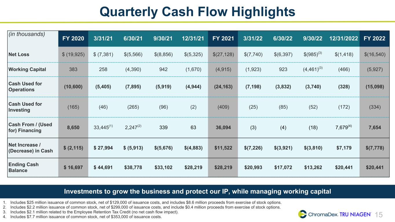 14 Quarterly Balance Sheet Highlights Invested in future growth, continued to manage working capital. Raised $7.7 million, net of offering costs, in October 2022. (in thousands) 12/31/20 3/31/21 6/30/21 9/30/21 12/31/21 3/31/22 6/30/22 9/30/22 12/31/22 Key Drivers (FY 2022 vs 2021) Cash $16,697 $44,691 $38,778 $33,102 $28,219 $20,993 $17,072 $13,262 $20,441 Cash used from operations to scale the business, offset by $7.7 million capital raise Inventory 11,683 12,762 12,183 12,676 13,601 15,307 15,753 15,636 14,677 Investments to support growth Trade Receivables 2,694 4,647 5,999 5,295 5,226 6,310 4,228 4,744 8,482 Driven by mix of customer sales and timing of collections, including $2.0MM Nestle upfront purchase Accrued Liabilities 6,133 7,328 5,569 6,331 6,481 8,126 6,696 6,756 7,337 Driven by changes in expenses and accrual for employee bonuses Accounts Payable 9,445 11,693 9,970 10,804 10,423 9,780 10,197 9,119 9,679 Driven by changes in inventory, advertising and legal expense Equity $16,424 $43,832 $42,142 $35,449 $31,727 $25,877 $20,778 $21,023 $28,672 Driven by $7.7 million capital raise