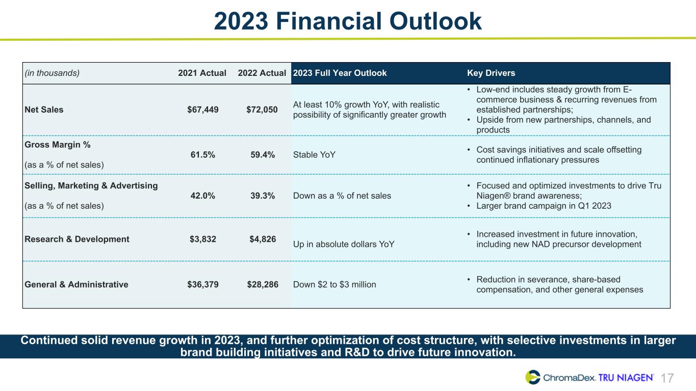 16 2022 Full Year Outlook Recap (in thousands) 2021 Actual 2022 Outlook (1) 2022 Actual Comments Achieved?(2) Net Sales $67,449 High single digits growth YoY $72,050 Total net sales grew by +7% and Tru Niagen® net sales grew by +6% year- over-year ü Gross Margin % (as a % of net sales) 61.5% Approximately 60% 59.4% Reflects strength of business model, navigating significant cost inflation ü Selling, Marketing & Advertising (as a % of net sales) 42.0% Down as a % of net sales 39.3% Down (270) bps as a % of net sales year-over-year ü Research & Development $3,832 Up approximately $1 million $4,826 Up $1.0 million year-over-year ü General & Administrative $36,379 Down $6 to $8 million $28,286 Down $(8.1) million year-over-year ü Adjusted EBITDA $(18,901) Outlook not provided $(9,973) Improvement of $8.9 million year-over- year reflecting higher sales and lower overall operating expense N/A Company delivered on its latest financial outlook across all metrics and exceeded target for G&A expense reduction. (1) 2022 Outlook as presented on Q2 2022 earnings call, except for G&A. 2022 Outlook for G&A updated on Q3 2022 earnings call, previous outlook was "G&A Down $6-7MM". (2) Compares 2022 actuals to 2022 Outlook.