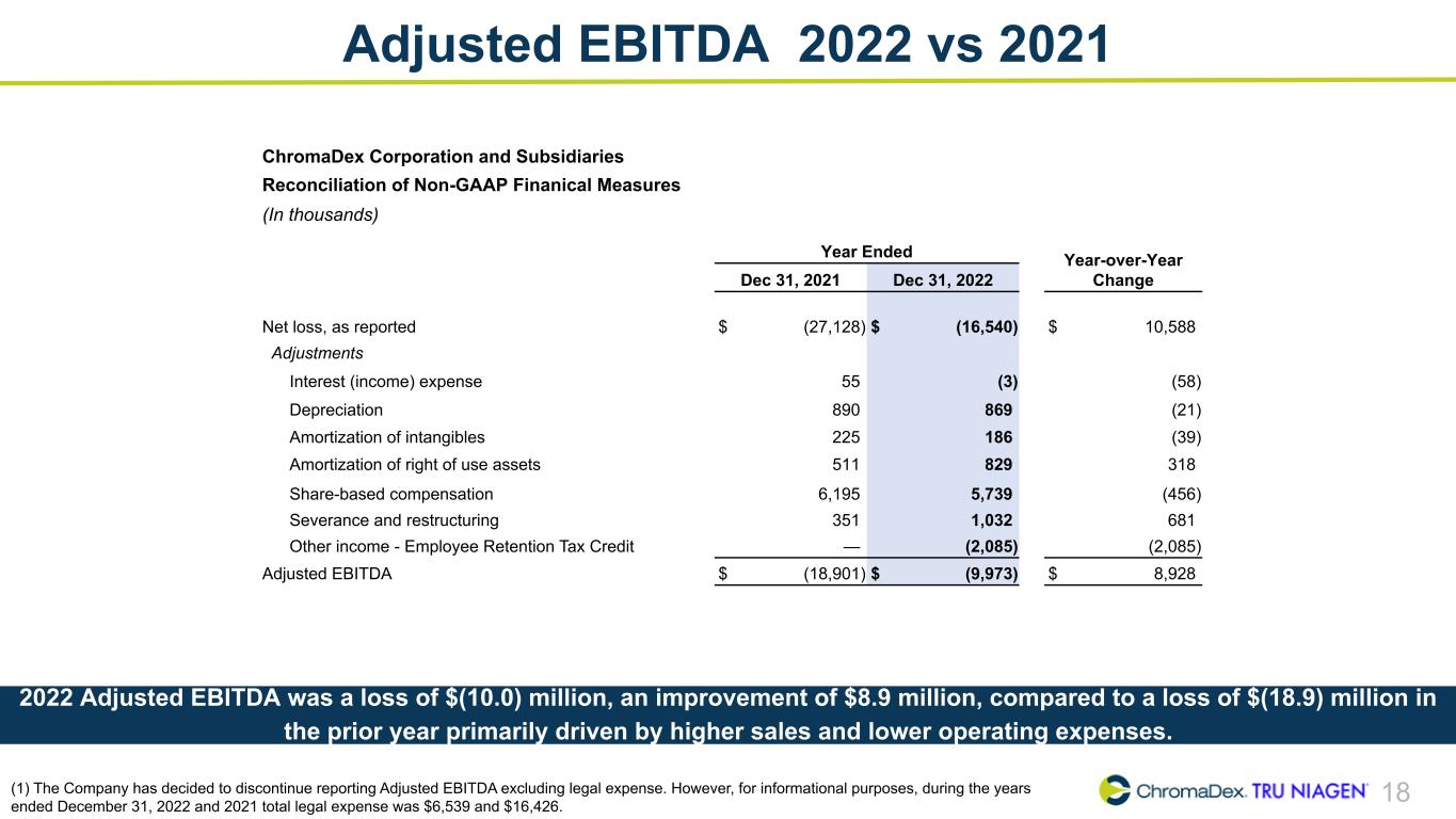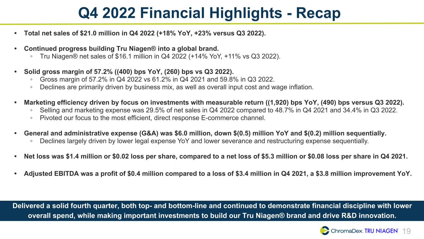 18 Adjusted EBITDA 2022 vs 2021 ChromaDex Corporation and Subsidiaries Reconciliation of Non-GAAP Finanical Measures (In thousands) Year Ended Year-over-Year ChangeDec 31, 2021 Dec 31, 2022 Net loss, as reported $ (27,128) $ (16,540) $ 10,588 Adjustments Interest (income) expense 55 (3) (58) Depreciation 890 869 (21) Amortization of intangibles 225 186 (39) Amortization of right of use assets 511 829 318 Share-based compensation 6,195 5,739 (456) Severance and restructuring 351 1,032 681 Other income - Employee Retention Tax Credit — (2,085) (2,085) Adjusted EBITDA $ (18,901) $ (9,973) $ 8,928 2022 Adjusted EBITDA was a loss of $(10.0) million, an improvement of $8.9 million, compared to a loss of $(18.9) million in the prior year primarily driven by higher sales and lower operating expenses. (1) The Company has decided to discontinue reporting Adjusted EBITDA excluding legal expense. However, for informational purposes, during the years ended December 31, 2022 and 2021 total legal expense was $6,539 and $16,426.