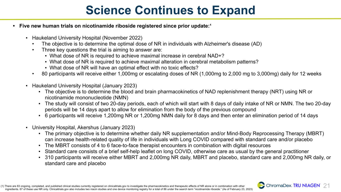 21 • Five new human trials on nicotinamide riboside registered since prior update:¹ ▪ Haukeland University Hospital (November 2022) • The objective is to determine the optimal dose of NR in individuals with Alzheimer's disease (AD) • Three key questions the trial is aiming to answer are: ▪ What dose of NR is required to achieve maximal increase in cerebral NAD+? ▪ What dose of NR is required to achieve maximal alteration in cerebral metabolism patterns? ▪ What dose of NR will have an optimal effect with no toxic effects? • 80 participants will receive either 1,000mg or escalating doses of NR (1,000mg to 2,000 mg to 3,000mg) daily for 12 weeks ▪ Haukeland University Hospital (January 2023) ▪ The objective is to determine the blood and brain pharmacokinetics of NAD replenishment therapy (NRT) using NR or nicotinamide mononucleotide (NMN) ▪ The study will consist of two 20-day periods, each of which will start with 8 days of daily intake of NR or NMN. The two 20-day periods will be 14 days apart to allow for elimination from the body of the previous compound ▪ 6 participants will receive 1,200mg NR or 1,200mg NMN daily for 8 days and then enter an elimination period of 14 days ▪ University Hospital, Akershus (January 2023) ▪ The primary objective is to determine whether daily NR supplementation and/or Mind-Body Reprocessing Therapy (MBRT) can increase health-related quality of life in individuals with Long COVID compared with standard care and/or placebo ▪ The MBRT consists of 4 to 6 face-to-face therapist encounters in combination with digital resources ▪ Standard care consists of a brief self-help leaflet on long COVID, otherwise care as usual by the general practitioner ▪ 310 participants will receive either MBRT and 2,000mg NR daily, MBRT and placebo, standard care and 2,000mg NR daily, or standard care and placebo (1) There are 83 ongoing, completed, and published clinical studies currently registered on clinicaltrials.gov to investigate the pharmacokinetics and therapeutic effects of NR alone or in combination with other ingredients. 67 of these use NR only. Clinicaltrials.gov also includes two niacin studies and one device monitoring registry for a total of 86 under the search term “nicotinamide riboside.” (As of February 23, 2023) Science Continues to Expand