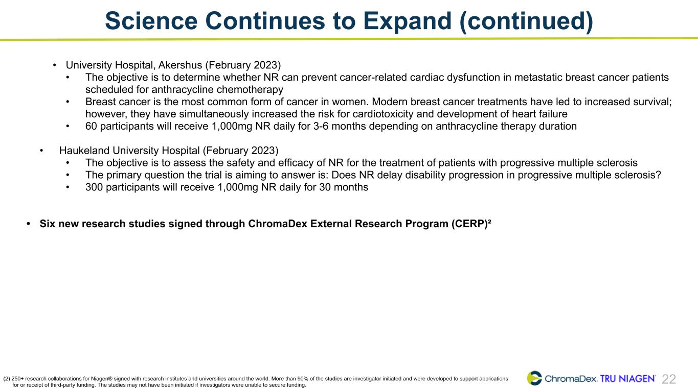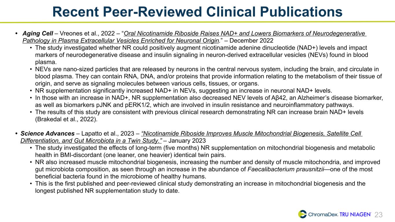 22 • University Hospital, Akershus (February 2023) • The objective is to determine whether NR can prevent cancer-related cardiac dysfunction in metastatic breast cancer patients scheduled for anthracycline chemotherapy • Breast cancer is the most common form of cancer in women. Modern breast cancer treatments have led to increased survival; however, they have simultaneously increased the risk for cardiotoxicity and development of heart failure • 60 participants will receive 1,000mg NR daily for 3-6 months depending on anthracycline therapy duration • Haukeland University Hospital (February 2023) • The objective is to assess the safety and efficacy of NR for the treatment of patients with progressive multiple sclerosis • The primary question the trial is aiming to answer is: Does NR delay disability progression in progressive multiple sclerosis? • 300 participants will receive 1,000mg NR daily for 30 months • Six new research studies signed through ChromaDex External Research Program (CERP)² (2) 250+ research collaborations for Niagen® signed with research institutes and universities around the world. More than 90% of the studies are investigator initiated and were developed to support applications for or receipt of third-party funding. The studies may not have been initiated if investigators were unable to secure funding. Science Continues to Expand (continued)