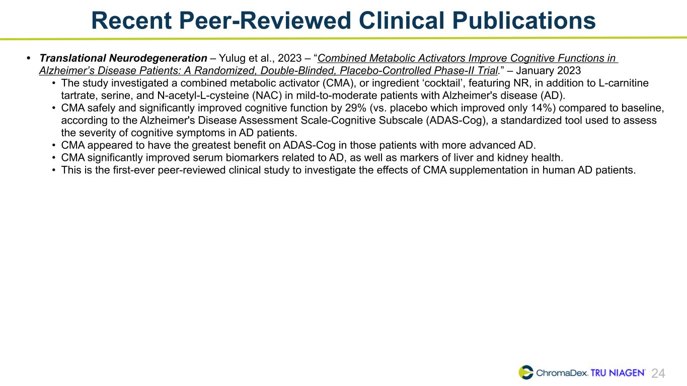 24 Recent Peer-Reviewed Clinical Publications • Translational Neurodegeneration – Yulug et al., 2023 – “Combined Metabolic Activators Improve Cognitive Functions in Alzheimer’s Disease Patients: A Randomized, Double-Blinded, Placebo-Controlled Phase-II Trial.” – January 2023 • The study investigated a combined metabolic activator (CMA), or ingredient ‘cocktail’, featuring NR, in addition to L-carnitine tartrate, serine, and N-acetyl-L-cysteine (NAC) in mild-to-moderate patients with Alzheimer's disease (AD). • CMA safely and significantly improved cognitive function by 29% (vs. placebo which improved only 14%) compared to baseline, according to the Alzheimer's Disease Assessment Scale-Cognitive Subscale (ADAS-Cog), a standardized tool used to assess the severity of cognitive symptoms in AD patients. • CMA appeared to have the greatest benefit on ADAS-Cog in those patients with more advanced AD. • CMA significantly improved serum biomarkers related to AD, as well as markers of liver and kidney health. • This is the first-ever peer-reviewed clinical study to investigate the effects of CMA supplementation in human AD patients.