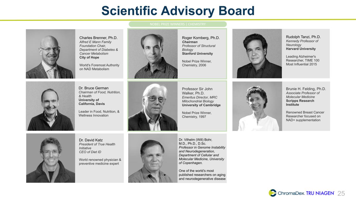 25 Scientific Advisory Board Charles Brenner, Ph.D. Alfred E Mann Family Foundation Chair, Department of Diabetes & Cancer Metabolism City of Hope World's Foremost Authority on NAD Metabolism Roger Kornberg, Ph.D. Chairman Professor of Structural Biology Stanford University Nobel Prize Winner, Chemistry, 2006 Rudolph Tanzi, Ph.D. Kennedy Professor of Neurology Harvard University Leading Alzheimer's Researcher, TIME 100 Most Influential 2015 Dr. Bruce German Chairman of Food, Nutrition, & Health University of California, Davis Leader in Food, Nutrition, & Wellness Innovation Professor Sir John Walker, Ph.D. Emeritus Director, MRC Mitochondrial Biology University of Cambridge Nobel Prize Winner, Chemistry, 1997 Brunie H. Felding, Ph.D. Associate Professor of Molecular Medicine Scripps Research Institute Renowned Breast Cancer Researcher focused on NAD+ supplementation Dr. David Katz President of True Health Initiative CEO of Diet ID World renowned physician & preventive medicine expert Dr. Vilhelm (Will) Bohr, M.D., Ph.D., D.Sc. Professor in Genome Instability and Neurodegeneration, Department of Cellular and Molecular Medicine, University of Copenhagen. One of the world’s most published researchers on aging and neurodegenerative disease NOBEL PRIZE WINNERS | CHEMISTRY