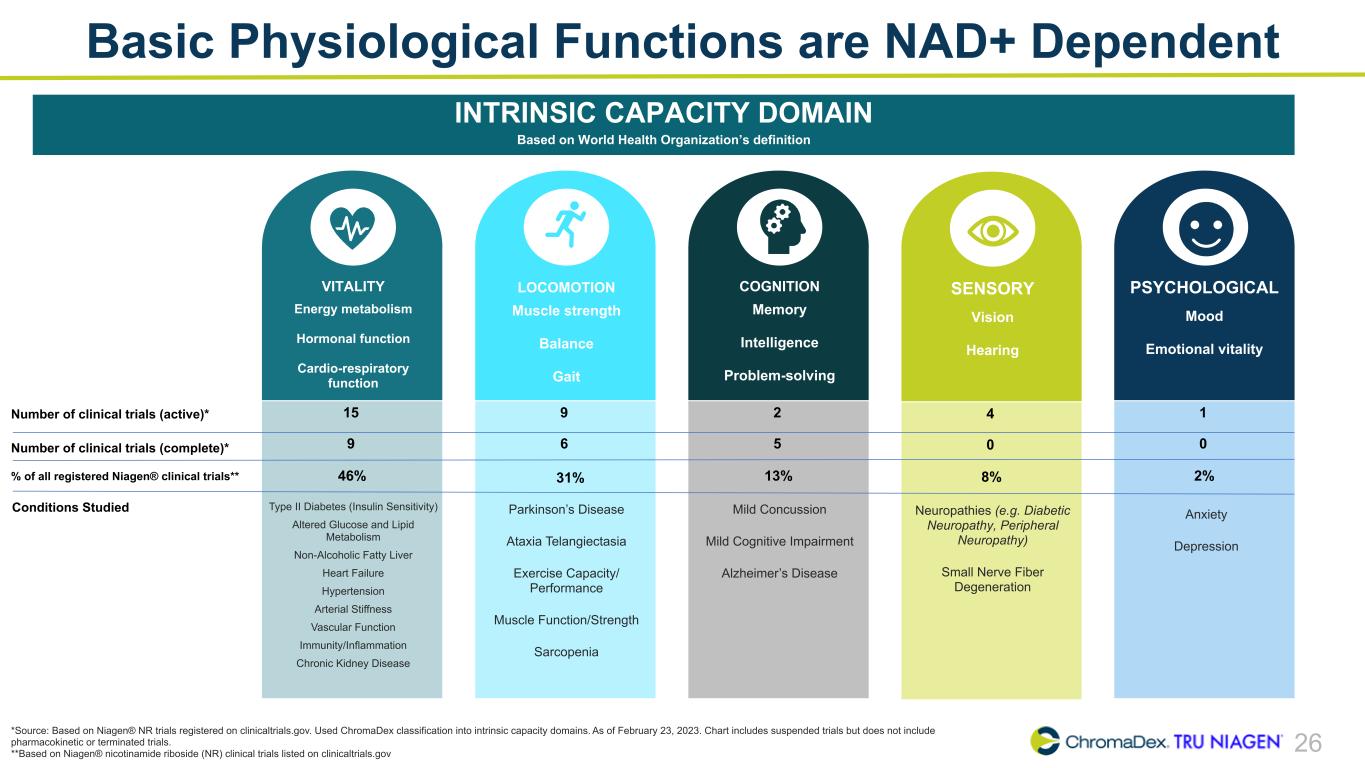 26 Basic Physiological Functions are NAD+ Dependent INTRINSIC CAPACITY DOMAIN Based on World Health Organization’s definition VITALITY Energy metabolism Hormonal function Cardio-respiratory function Number of clinical trials (active)* 15 Number of clinical trials (complete)* 9 % of all registered Niagen® clinical trials** 46% Type II Diabetes (Insulin Sensitivity) Altered Glucose and Lipid Metabolism Non-Alcoholic Fatty Liver Heart Failure Hypertension Arterial Stiffness Vascular Function Immunity/Inflammation Chronic Kidney Disease Conditions Studied LOCOMOTION Muscle strength Balance Gait 9 6 Parkinson’s Disease Ataxia Telangiectasia Exercise Capacity/ Performance Muscle Function/Strength Sarcopenia COGNITION Memory Intelligence Problem-solving 2 5 13% Mild Concussion Mild Cognitive Impairment Alzheimer’s Disease SENSORY Vision Hearing 4 0 8% Neuropathies (e.g. Diabetic Neuropathy, Peripheral Neuropathy) Small Nerve Fiber Degeneration PSYCHOLOGICAL Mood Emotional vitality 1 0 2%31% *Source: Based on Niagen® NR trials registered on clinicaltrials.gov. Used ChromaDex classification into intrinsic capacity domains. As of February 23, 2023. Chart includes suspended trials but does not include pharmacokinetic or terminated trials. **Based on Niagen® nicotinamide riboside (NR) clinical trials listed on clinicaltrials.gov Anxiety Depression