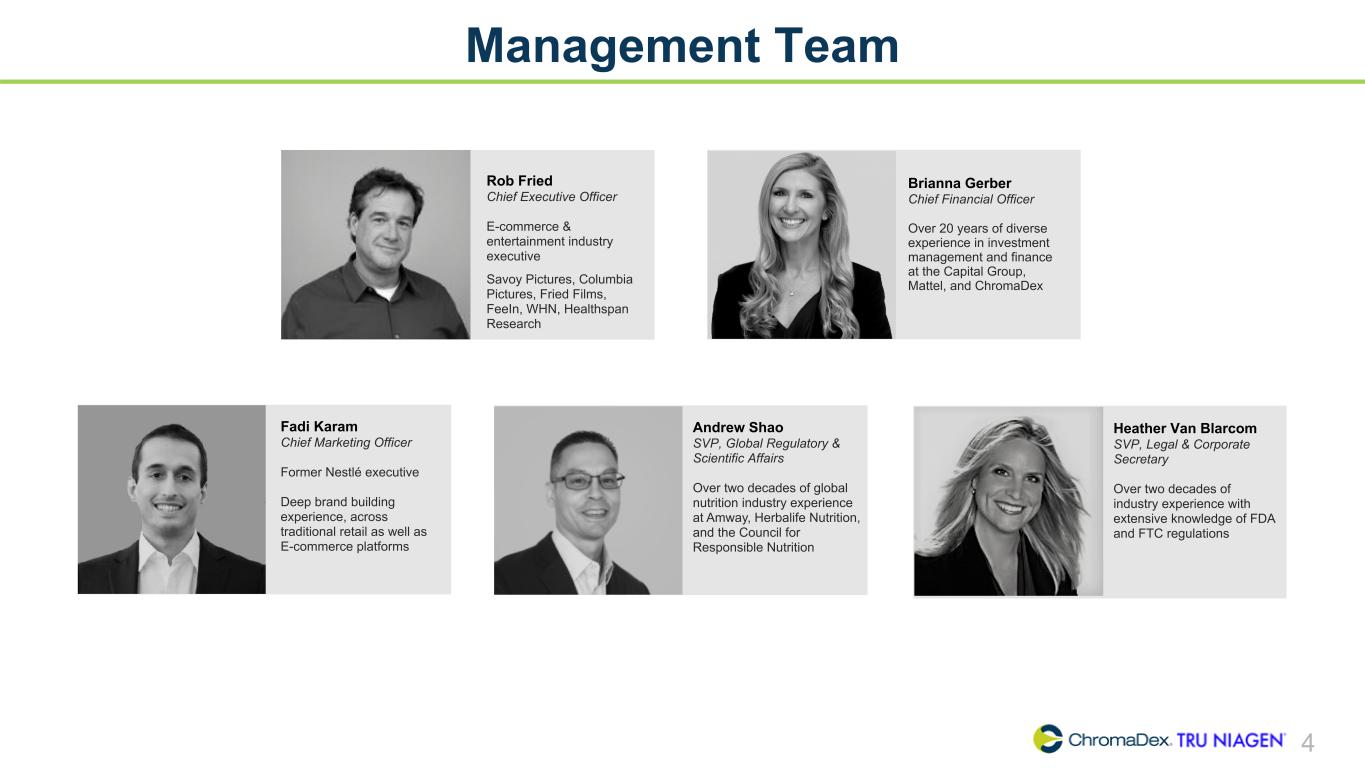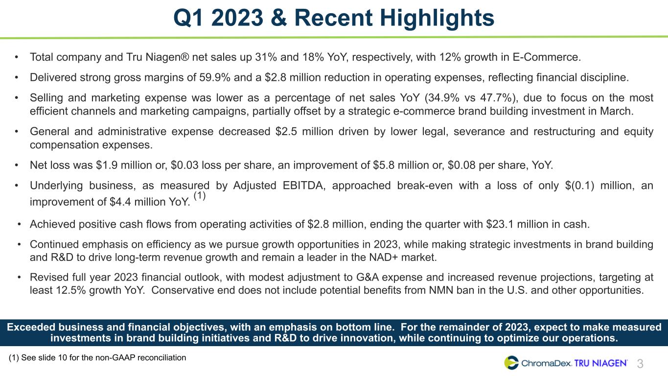 SAFE HARBOR STATEMENT SAFE HARBOR STATEMENT 2 This presentation and other written or oral statements made from time to time by representatives of ChromaDex contain “forward-looking statements” within the meaning of Section 27A of the Securities Act of 1933, as amended, and Section 21E of the Securities Exchange Act of 1934, as amended. Forward-looking statements reflect the current view about future events. Statements that are not historical in nature, such as 2023 financial outlook, and which may be identified by the use of words like “expects,” “anticipates,” “intends,” “estimates,” “plans,” “potential,” “possible,” “probable,” “believes,” “seeks,” “may,” “will,” “should,” “could,” “predicts,” “projects,” “continue,” “would” or the negative of these terms and other words of similar meaning, are forward-looking statements. Such statements include, but are not limited to, statements contained in this presentation relating to our expected sales, cash flows, planned investments, and financial performance, business, business strategy, expansion, growth, key drivers (including cost savings and increased investments), products and services we recently offered and their impact on our performance or products and services we may offer in the future and the timing of their development, sales and marketing strategy and capital outlook. Forward-looking statements are based on management’s current expectations and assumptions regarding our business, the economy and other future conditions and are subject to inherent risks, uncertainties and changes of circumstances that are difficult to predict and may cause actual results to differ materially from those contemplated or expressed. We caution you therefore against relying on any of these forward-looking statements. These risks and uncertainties include those risk factors discussed in Part I, “Item 1A. Risk Factors” of our most recent Annual Report on Form 10-K and Quarterly Report on Form 10-Q filed with the Securities Exchange Commission (the “Commission”), and in subsequent filings with the Commission. Any forward-looking statements are qualified in their entirety by reference to the factors discussed in these filings with the Commission. Should one or more of these risks or uncertainties materialize, or should the underlying assumptions prove incorrect, actual results may differ significantly from those anticipated, believed, estimated, expected, intended or planned. Important factors that could cause actual results to differ materially from those in the forward looking statements include but are not limited to: inflationary conditions and adverse economic conditions; our history of operating losses and need to obtain additional financing; the growth and profitability of our product sales; our ability to maintain sales, marketing and distribution capabilities; changing consumer perceptions of our products; our reliance on a single or limited number of third-party suppliers; risks of conducting business in China; and the risks and uncertainties associated with our business and financial condition in general. Factors or events that could cause our actual results to differ may emerge from time to time, and it is not possible for us to predict all of them. We cannot guarantee future results, levels of activity, performance or achievements. Except as required by applicable law, including the securities laws of the United States, we do not intend to update any of the forward-looking statements to conform these statements to actual results. About Non-GAAP Financial Measures ChromaDex’s non-GAAP financial measure, Adjusted EBITDA, is defined as net income before interest, depreciation, amortization, non-cash share-based compensation costs, severance and restructuring expense and other income from the Employee Retention Tax Credit. ChromaDex used this non-GAAP measures when evaluating its financial results as well as for internal resource management, planning and forecasting purposes. This non-GAAP measure should not be viewed in isolation from or as a substitute for ChromaDex’s financial results in accordance with GAAP. Reconciliation of this non-GAAP measure to the most directly comparable GAAP measure is attached to this presentation. FDA Disclaimer Statements made in this presentation have not been evaluated by the Food and Drug Administration. ChromaDex products are not intended to diagnose, treat, cure, or prevent any disease. The statements in this presentation are for investor relations and educational purposes only and not intended for consumers or vendors.