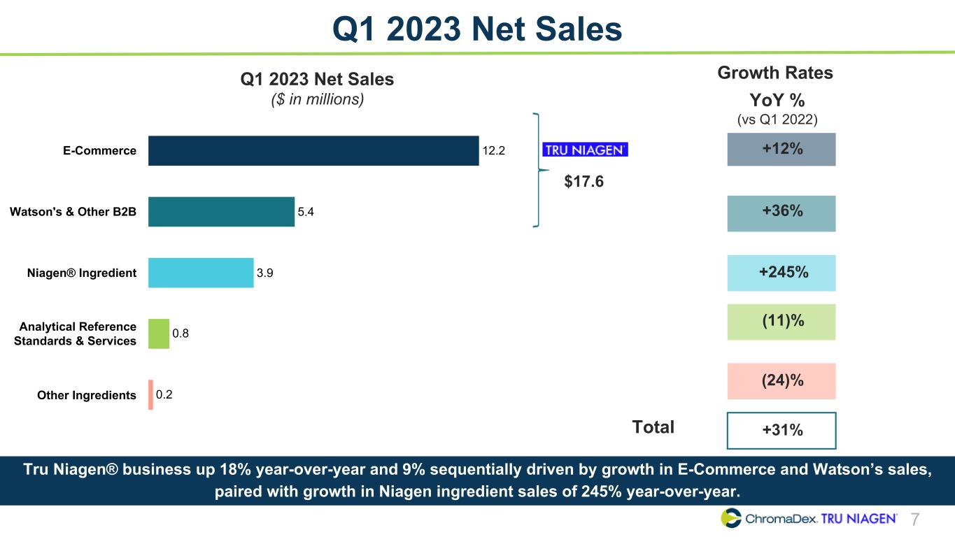 6 Q1 2023 Net Sales Mix E-Commerce 63% Watson's & Other B2B 24% Niagen® Ingredient 7% Analytical Reference Standards & Services 5% Other Ingredients 2% Q1 2022 $17.3 MM E-Commerce 54% Watson's & Other B2B 24% Niagen® Ingredient 17% Analytical Reference Standards & Services 4% Other Ingredients 1% $22.6 MM Q1 2023 • Tru Niagen® net sales decreased to 78% of net sales for Q1 2023 compared to 87% in Q1 2022(1) • Niagen®-related net sales increased to 95% of net sales in Q1 2023 compared to 93% in Q1 2022(2) Higher mix of Niagen® ingredient sales compared to prior year as Q1 2023 sales were boosted by increased demand from existing partners and development of a new partnership. Tru Niagen® sales remained strong. (1) Tru Niagen® net sales include E-Commerce, Watson’s/Other B2B (2) Niagen®-related sales include Tru Niagen® and Niagen® ingredient