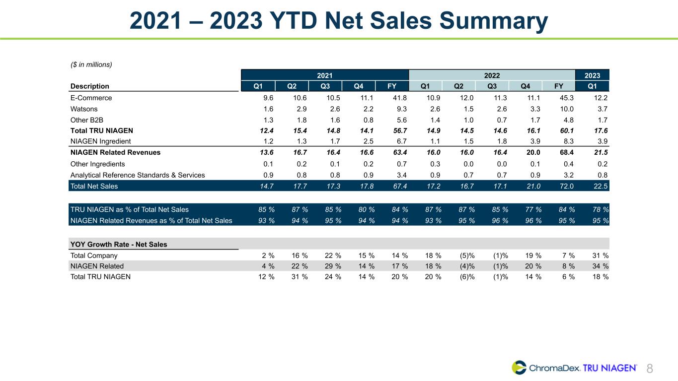 7 Q1 2023 Net Sales Q1 2023 Net Sales ($ in millions) 12.2 5.4 3.9 0.8 0.2 E-Commerce Watson's & Other B2B Niagen® Ingredient Analytical Reference Standards & Services Other Ingredients $17.6 YoY % (vs Q1 2022) +12% +36% +245% (11)% (24)% +31% Tru Niagen® business up 18% year-over-year and 9% sequentially driven by growth in E-Commerce and Watson’s sales, paired with growth in Niagen ingredient sales of 245% year-over-year. Total Growth Rates