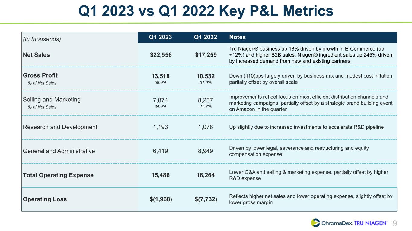 8 2021 – 2023 YTD Net Sales Summary ($ in millions) 2021 2022 2023 Description Q1 Q2 Q3 Q4 FY Q1 Q2 Q3 Q4 FY Q1 E-Commerce 9.6 10.6 10.5 11.1 41.8 10.9 12.0 11.3 11.1 45.3 12.2 Watsons 1.6 2.9 2.6 2.2 9.3 2.6 1.5 2.6 3.3 10.0 3.7 Other B2B 1.3 1.8 1.6 0.8 5.6 1.4 1.0 0.7 1.7 4.8 1.7 Total TRU NIAGEN 12.4 15.4 14.8 14.1 56.7 14.9 14.5 14.6 16.1 60.1 17.6 NIAGEN Ingredient 1.2 1.3 1.7 2.5 6.7 1.1 1.5 1.8 3.9 8.3 3.9 NIAGEN Related Revenues 13.6 16.7 16.4 16.6 63.4 16.0 16.0 16.4 20.0 68.4 21.5 Other Ingredients 0.1 0.2 0.1 0.2 0.7 0.3 0.0 0.0 0.1 0.4 0.2 Analytical Reference Standards & Services 0.9 0.8 0.8 0.9 3.4 0.9 0.7 0.7 0.9 3.2 0.8 Total Net Sales 14.7 17.7 17.3 17.8 67.4 17.2 16.7 17.1 21.0 72.0 22.5 TRU NIAGEN as % of Total Net Sales 85 % 87 % 85 % 80 % 84 % 87 % 87 % 85 % 77 % 84 % 78 % NIAGEN Related Revenues as % of Total Net Sales 93 % 94 % 95 % 94 % 94 % 93 % 95 % 96 % 96 % 95 % 95 % YOY Growth Rate - Net Sales Total Company 2 % 16 % 22 % 15 % 14 % 18 % (5) % (1) % 19 % 7 % 31 % NIAGEN Related 4 % 22 % 29 % 14 % 17 % 18 % (4) % (1) % 20 % 8 % 34 % Total TRU NIAGEN 12 % 31 % 24 % 14 % 20 % 20 % (6) % (1) % 14 % 6 % 18 %