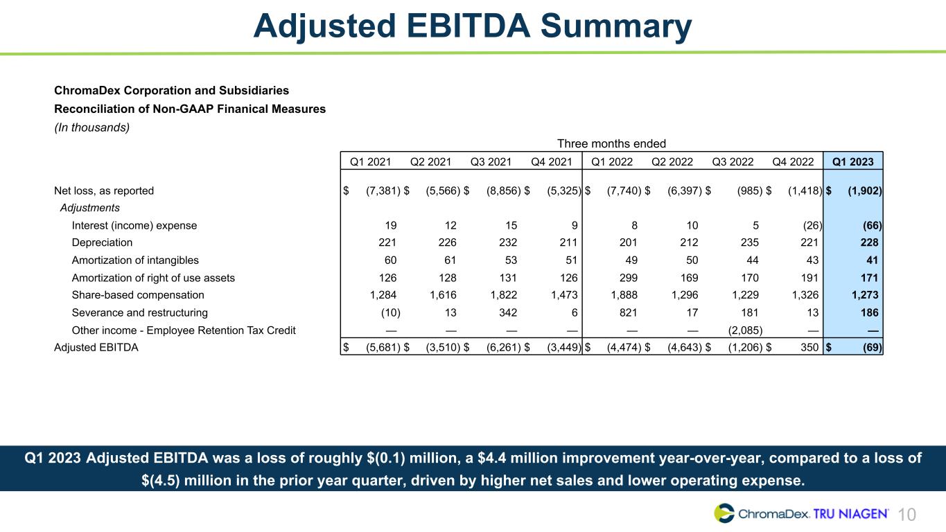 9 Q1 2023 vs Q1 2022 Key P&L Metrics (in thousands) Q1 2023 Q1 2022 Notes Net Sales $22,556 $17,259 Tru Niagen® business up 18% driven by growth in E-Commerce (up +12%) and higher B2B sales. Niagen® ingredient sales up 245% driven by increased demand from new and existing partners. Gross Profit % of Net Sales 13,518 59.9% 10,532 61.0% Down (110)bps largely driven by business mix and modest cost inflation, partially offset by overall scale Selling and Marketing % of Net Sales 7,874 34.9% 8,237 47.7% Improvements reflect focus on most efficient distribution channels and marketing campaigns, partially offset by a strategic brand building event on Amazon in the quarter Research and Development 1,193 1,078 Up slightly due to increased investments to accelerate R&D pipeline General and Administrative 6,419 8,949 Driven by lower legal, severance and restructuring and equity compensation expense Total Operating Expense 15,486 18,264 Lower G&A and selling & marketing expense, partially offset by higher R&D expense Operating Loss $(1,968) $(7,732) Reflects higher net sales and lower operating expense, slightly offset by lower gross margin