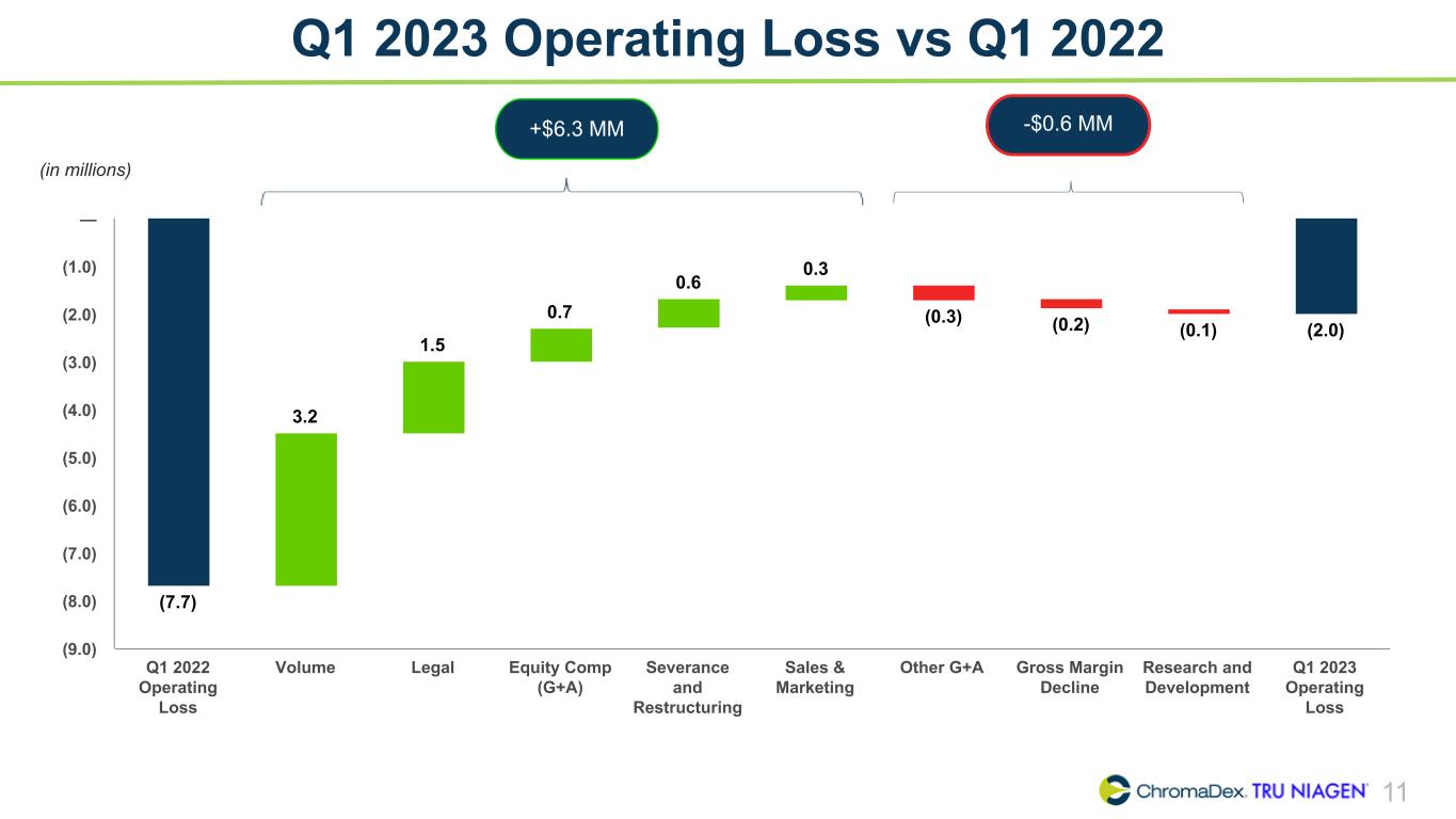 10 Adjusted EBITDA Summary ChromaDex Corporation and Subsidiaries Reconciliation of Non-GAAP Finanical Measures (In thousands) Three months ended Q1 2021 Q2 2021 Q3 2021 Q4 2021 Q1 2022 Q2 2022 Q3 2022 Q4 2022 Q1 2023 Net loss, as reported $ (7,381) $ (5,566) $ (8,856) $ (5,325) $ (7,740) $ (6,397) $ (985) $ (1,418) $ (1,902) Adjustments Interest (income) expense 19 12 15 9 8 10 5 (26) (66) Depreciation 221 226 232 211 201 212 235 221 228 Amortization of intangibles 60 61 53 51 49 50 44 43 41 Amortization of right of use assets 126 128 131 126 299 169 170 191 171 Share-based compensation 1,284 1,616 1,822 1,473 1,888 1,296 1,229 1,326 1,273 Severance and restructuring (10) 13 342 6 821 17 181 13 186 Other income - Employee Retention Tax Credit — — — — — — (2,085) — — Adjusted EBITDA $ (5,681) $ (3,510) $ (6,261) $ (3,449) $ (4,474) $ (4,643) $ (1,206) $ 350 $ (69) Q1 2023 Adjusted EBITDA was a loss of roughly $(0.1) million, a $4.4 million improvement year-over-year, compared to a loss of $(4.5) million in the prior year quarter, driven by higher net sales and lower operating expense.
