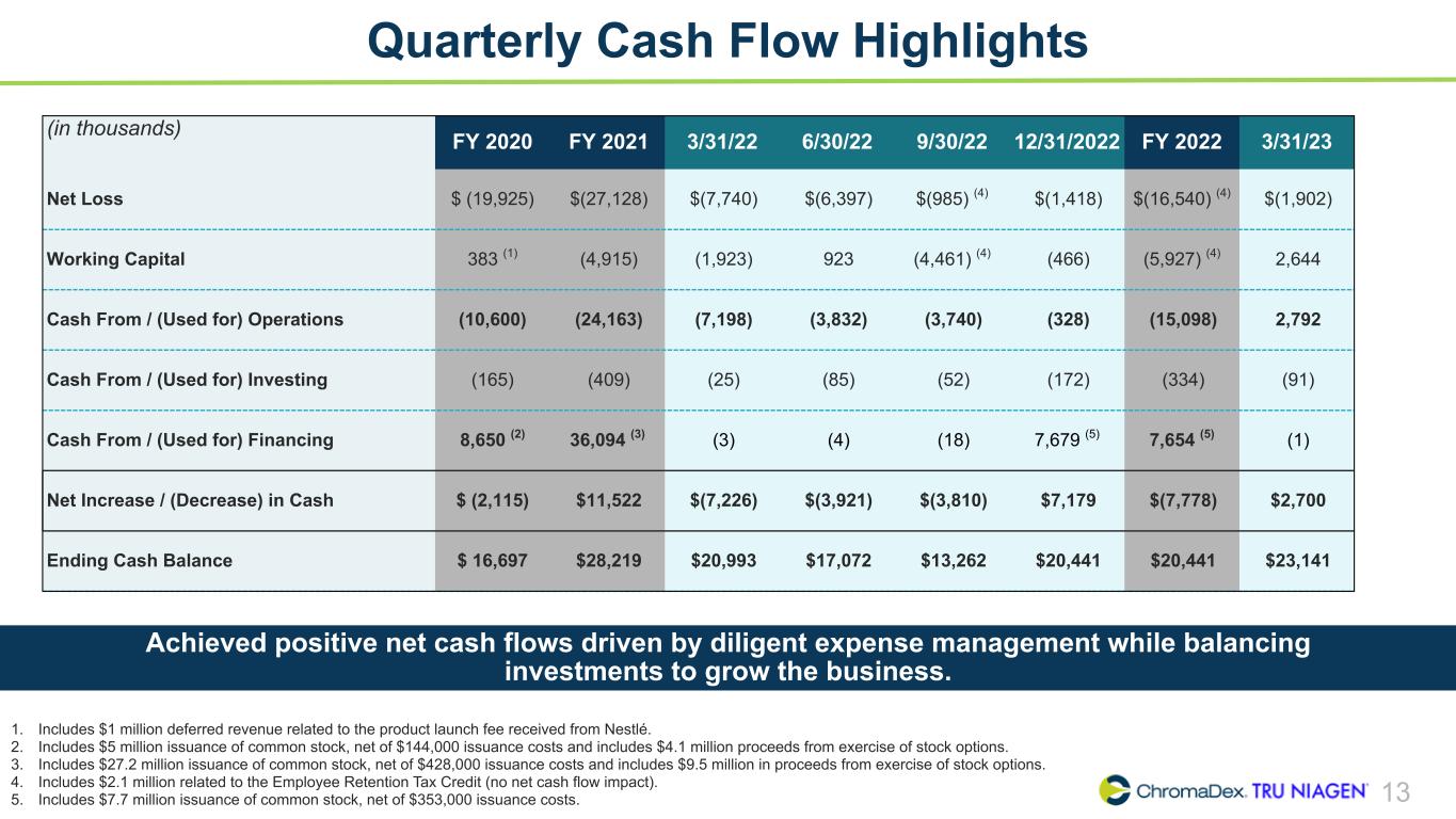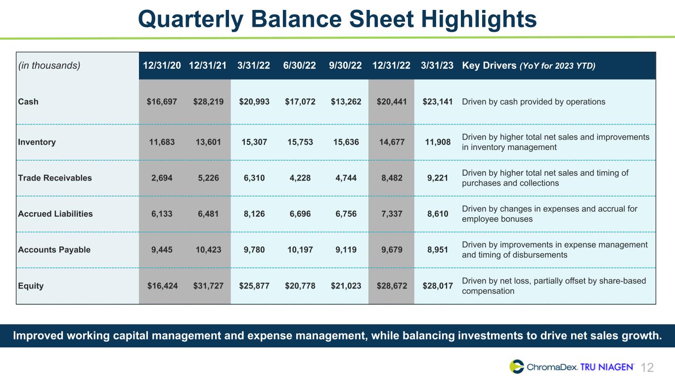 12 Quarterly Balance Sheet Highlights (in thousands) 12/31/20 12/31/21 3/31/22 6/30/22 9/30/22 12/31/22 3/31/23 Key Drivers (YoY for 2023 YTD) Cash $16,697 $28,219 $20,993 $17,072 $13,262 $20,441 $23,141 Driven by cash provided by operations Inventory 11,683 13,601 15,307 15,753 15,636 14,677 11,908 Driven by higher total net sales and improvements in inventory management Trade Receivables 2,694 5,226 6,310 4,228 4,744 8,482 9,221 Driven by higher total net sales and timing of purchases and collections Accrued Liabilities 6,133 6,481 8,126 6,696 6,756 7,337 8,610 Driven by changes in expenses and accrual for employee bonuses Accounts Payable 9,445 10,423 9,780 10,197 9,119 9,679 8,951 Driven by improvements in expense management and timing of disbursements Equity $16,424 $31,727 $25,877 $20,778 $21,023 $28,672 $28,017 Driven by net loss, partially offset by share-based compensation Improved working capital management and expense management, while balancing investments to drive net sales growth.