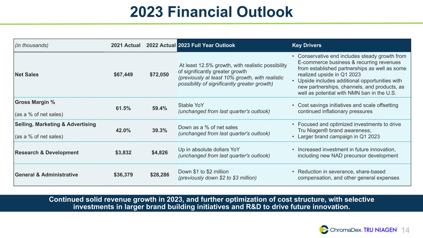 13 Quarterly Cash Flow Highlights Achieved positive net cash flows driven by diligent expense management while balancing investments to grow the business. (in thousands) FY 2020 FY 2021 3/31/22 6/30/22 9/30/22 12/31/2022 FY 2022 3/31/23 Net Loss $ (19,925) $(27,128) $(7,740) $(6,397) $(985) (4) $(1,418) $(16,540) (4) $(1,902) Working Capital 383 (1) (4,915) (1,923) 923 (4,461) (4) (466) (5,927) (4) 2,644 Cash From / (Used for) Operations (10,600) (24,163) (7,198) (3,832) (3,740) (328) (15,098) 2,792 Cash From / (Used for) Investing (165) (409) (25) (85) (52) (172) (334) (91) Cash From / (Used for) Financing 8,650 (2) 36,094 (3) (3) (4) (18) 7,679 (5) 7,654 (5) (1) Net Increase / (Decrease) in Cash $ (2,115) $11,522 $(7,226) $(3,921) $(3,810) $7,179 $(7,778) $2,700 Ending Cash Balance $ 16,697 $28,219 $20,993 $17,072 $13,262 $20,441 $20,441 $23,141 1. Includes $1 million deferred revenue related to the product launch fee received from Nestlé. 2. Includes $5 million issuance of common stock, net of $144,000 issuance costs and includes $4.1 million proceeds from exercise of stock options. 3. Includes $27.2 million issuance of common stock, net of $428,000 issuance costs and includes $9.5 million in proceeds from exercise of stock options. 4. Includes $2.1 million related to the Employee Retention Tax Credit (no net cash flow impact). 5. Includes $7.7 million issuance of common stock, net of $353,000 issuance costs.