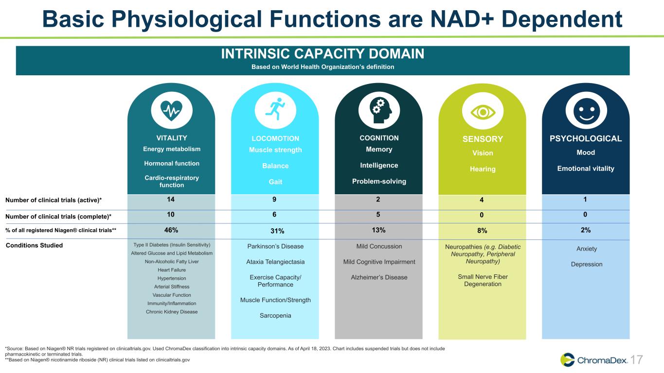 17 Basic Physiological Functions are NAD+ Dependent INTRINSIC CAPACITY DOMAIN Based on World Health Organization’s definition VITALITY Energy metabolism Hormonal function Cardio-respiratory function Number of clinical trials (active)* 14 Number of clinical trials (complete)* 10 % of all registered Niagen® clinical trials** 46% Type II Diabetes (Insulin Sensitivity) Altered Glucose and Lipid Metabolism Non-Alcoholic Fatty Liver Heart Failure Hypertension Arterial Stiffness Vascular Function Immunity/Inflammation Chronic Kidney Disease Conditions Studied LOCOMOTION Muscle strength Balance Gait 9 6 Parkinson’s Disease Ataxia Telangiectasia Exercise Capacity/ Performance Muscle Function/Strength Sarcopenia COGNITION Memory Intelligence Problem-solving 2 5 13% Mild Concussion Mild Cognitive Impairment Alzheimer’s Disease SENSORY Vision Hearing 4 0 8% Neuropathies (e.g. Diabetic Neuropathy, Peripheral Neuropathy) Small Nerve Fiber Degeneration PSYCHOLOGICAL Mood Emotional vitality 1 0 2%31% *Source: Based on Niagen® NR trials registered on clinicaltrials.gov. Used ChromaDex classification into intrinsic capacity domains. As of April 18, 2023. Chart includes suspended trials but does not include pharmacokinetic or terminated trials. **Based on Niagen® nicotinamide riboside (NR) clinical trials listed on clinicaltrials.gov Anxiety Depression
