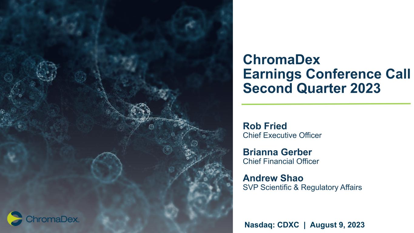 ChromaDex Earnings Conference Call Second Quarter 2023 Rob Fried Chief Executive Officer Brianna Gerber Chief Financial Officer Andrew Shao SVP Scientific & Regulatory Affairs Nasdaq: CDXC | August 9, 2023