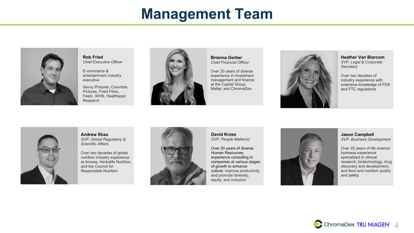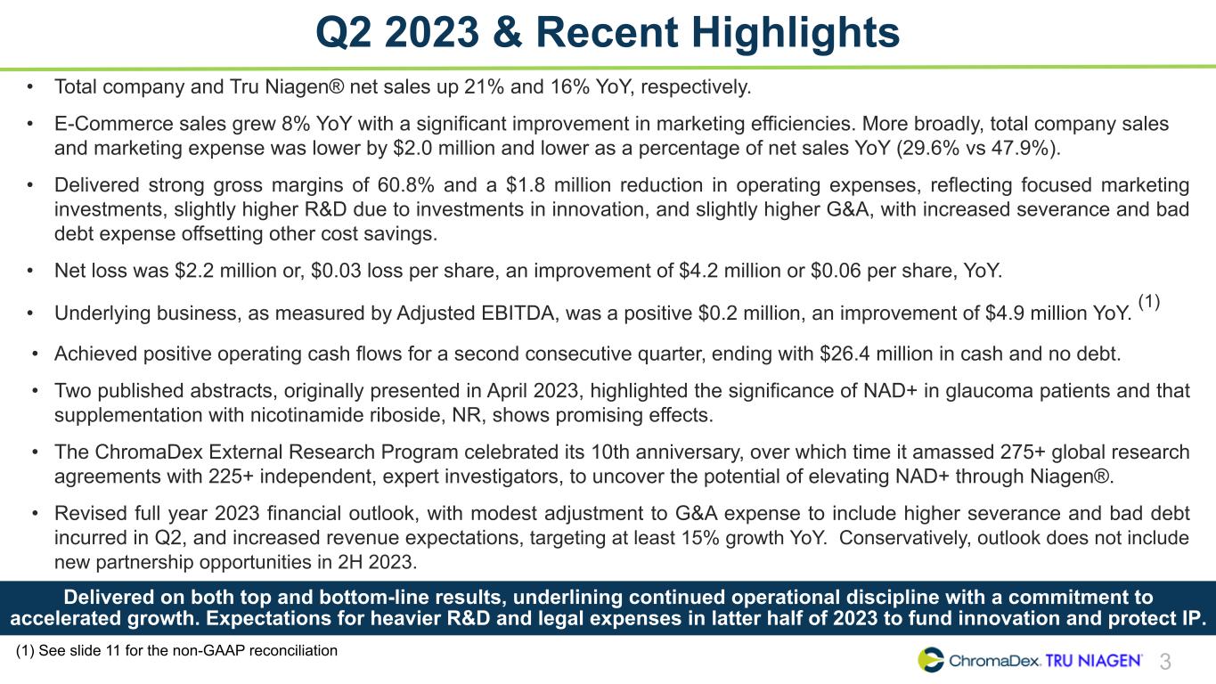 SAFE HARBOR STATEMENT SAFE HARBOR STATEMENT 2 This presentation and other written or oral statements made from time to time by representatives of ChromaDex contain “forward-looking statements” within the meaning of Section 27A of the Securities Act of 1933, as amended, and Section 21E of the Securities Exchange Act of 1934, as amended. Forward-looking statements reflect the current view about future events. Statements that are not historical in nature, such as 2023 financial outlook, and which may be identified by the use of words like “expects,” “anticipates,” “intends,” “estimates,” “plans,” “potential,” “possible,” “probable,” “believes,” “seeks,” “may,” “will,” “should,” “could,” “predicts,” “projects,” “continue,” “would” or the negative of these terms and other words of similar meaning, are forward-looking statements. Such statements include, but are not limited to, statements contained in this presentation relating to our expected sales, cash flows, planned investments, and financial performance, business, business strategy, expansion, growth, key drivers (including cost savings and increased investments), products and services we recently offered and their impact on our performance or products and services we may offer in the future and the timing of their development, sales and marketing strategy and capital outlook. Forward-looking statements are based on management’s current expectations and assumptions regarding our business, the economy and other future conditions and are subject to inherent risks, uncertainties and changes of circumstances that are difficult to predict and may cause actual results to differ materially from those contemplated or expressed. We caution you therefore against relying on any of these forward-looking statements. These risks and uncertainties include those risk factors discussed in Part I, “Item 1A. Risk Factors” of our most recent Annual Report on Form 10-K and Quarterly Report on Form 10-Q filed with the Securities Exchange Commission (the “Commission”), and in subsequent filings with the Commission. Any forward-looking statements are qualified in their entirety by reference to the factors discussed in these filings with the Commission. Should one or more of these risks or uncertainties materialize, or should the underlying assumptions prove incorrect, actual results may differ significantly from those anticipated, believed, estimated, expected, intended or planned. Important factors that could cause actual results to differ materially from those in the forward looking statements include but are not limited to: inflationary conditions and adverse economic conditions; our history of operating losses and need to obtain additional financing; the growth and profitability of our product sales; our ability to maintain sales, marketing and distribution capabilities; changing consumer perceptions of our products; our reliance on a single or limited number of third-party suppliers; risks of conducting business in China; and the risks and uncertainties associated with our business and financial condition in general. Factors or events that could cause our actual results to differ may emerge from time to time, and it is not possible for us to predict all of them. We cannot guarantee future results, levels of activity, performance or achievements. Except as required by applicable law, including the securities laws of the United States, we do not intend to update any of the forward-looking statements to conform these statements to actual results. About Non-GAAP Financial Measures ChromaDex’s non-GAAP financial measure, Adjusted EBITDA, is defined as net income before interest, depreciation, amortization, non-cash share-based compensation costs, severance and restructuring expense and other income from the Employee Retention Tax Credit. ChromaDex used this non-GAAP measures when evaluating its financial results as well as for internal resource management, planning and forecasting purposes. This non-GAAP measure should not be viewed in isolation from or as a substitute for ChromaDex’s financial results in accordance with GAAP. Reconciliation of this non-GAAP measure to the most directly comparable GAAP measure is attached to this presentation. FDA Disclaimer Statements made in this presentation have not been evaluated by the Food and Drug Administration. ChromaDex products are not intended to diagnose, treat, cure, or prevent any disease. The statements in this presentation are for investor relations and educational purposes only and not intended for consumers or vendors.
