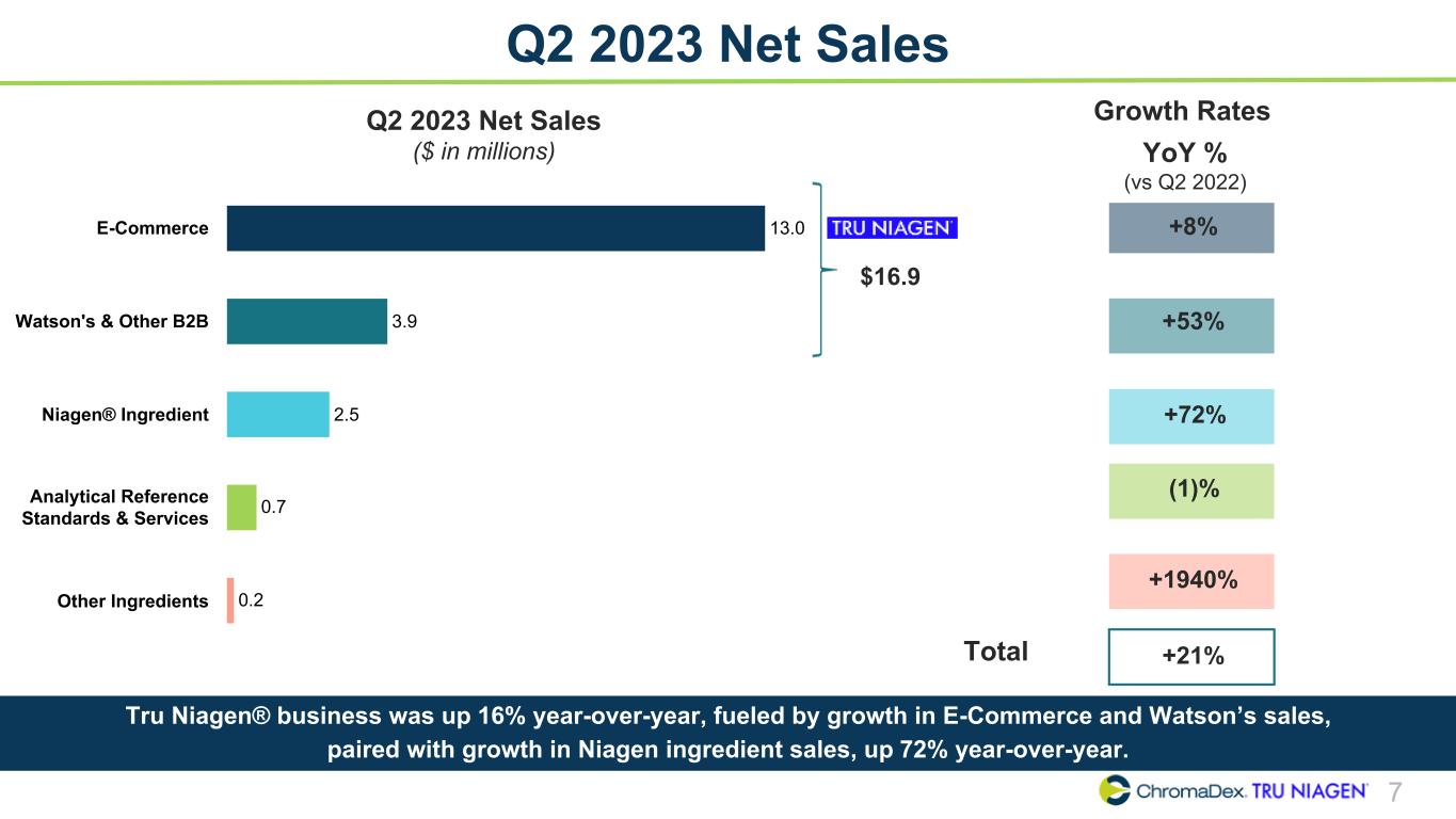 6 Q2 2023 Net Sales Mix E-Commerce 65% Watson's & Other B2B 23% Niagen® Ingredient 8% Analytical Reference Standards & Services 4% Q2 2022 $16.7 MM E-Commerce 64% Watson's & Other B2B 19% Niagen® Ingredient 12% Analytical Reference Standards & Services 4% Other Ingredients 1% $20.3 MM Q2 2023 • Tru Niagen® net sales decreased to 83% of net sales for Q2 2023 compared to 87% in Q2 2022(1) • Niagen®-related net sales remained steady at 95% of net sales for both Q2 2023 and Q2 2022(2) Higher mix of Niagen® ingredient sales compared to the prior year as Q2 2023 sales were boosted by strengthened relationships with existing partners. (1) Tru Niagen® net sales include E-Commerce, Watson’s/Other B2B (2) Niagen®-related sales include Tru Niagen® and Niagen® ingredient