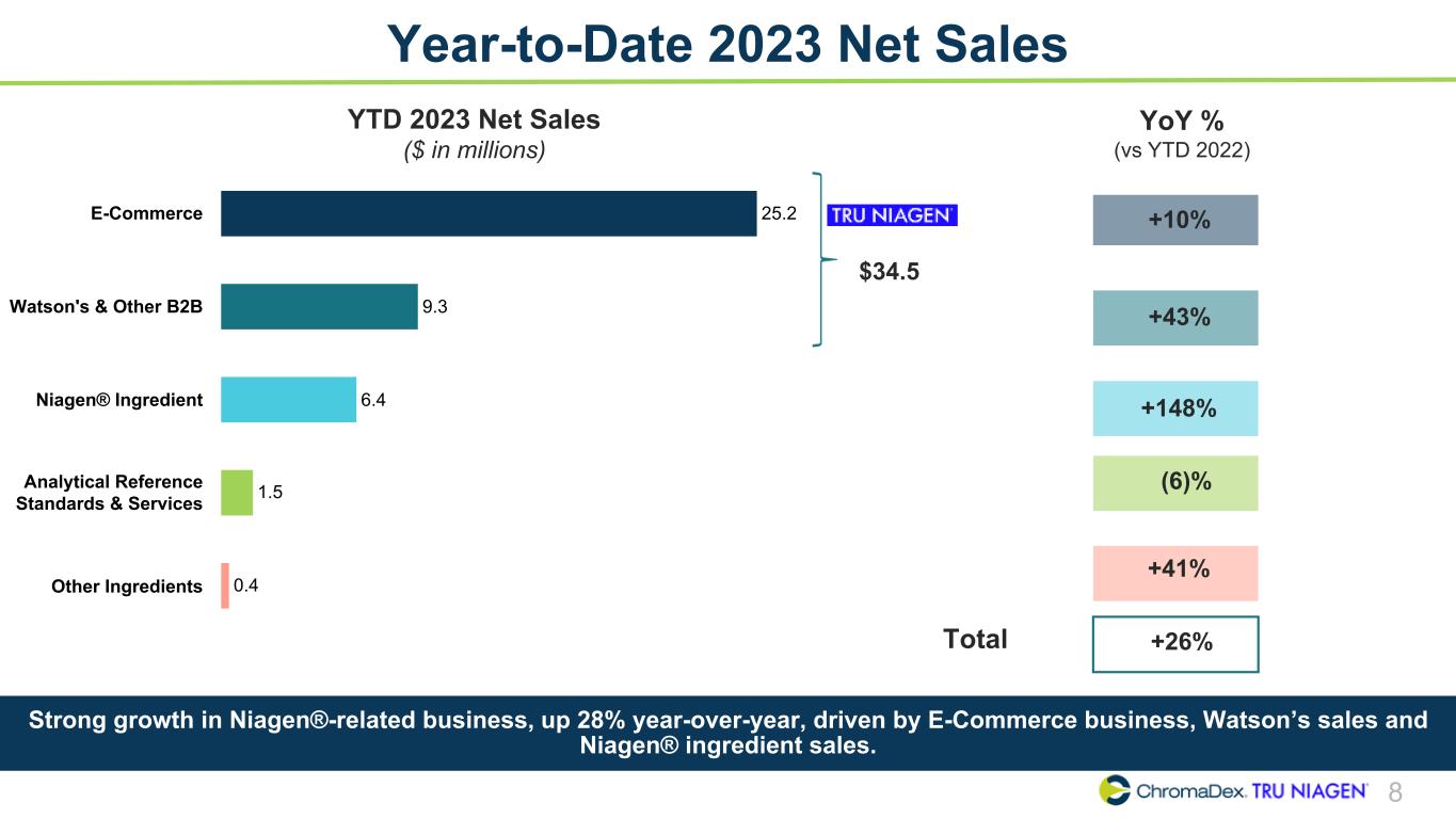 7 Q2 2023 Net Sales Q2 2023 Net Sales ($ in millions) 13.0 3.9 2.5 0.7 0.2 E-Commerce Watson's & Other B2B Niagen® Ingredient Analytical Reference Standards & Services Other Ingredients $16.9 YoY % (vs Q2 2022) +8% +53% +72% (1)% +1940% +21% Tru Niagen® business was up 16% year-over-year, fueled by growth in E-Commerce and Watson’s sales, paired with growth in Niagen ingredient sales, up 72% year-over-year. Total Growth Rates