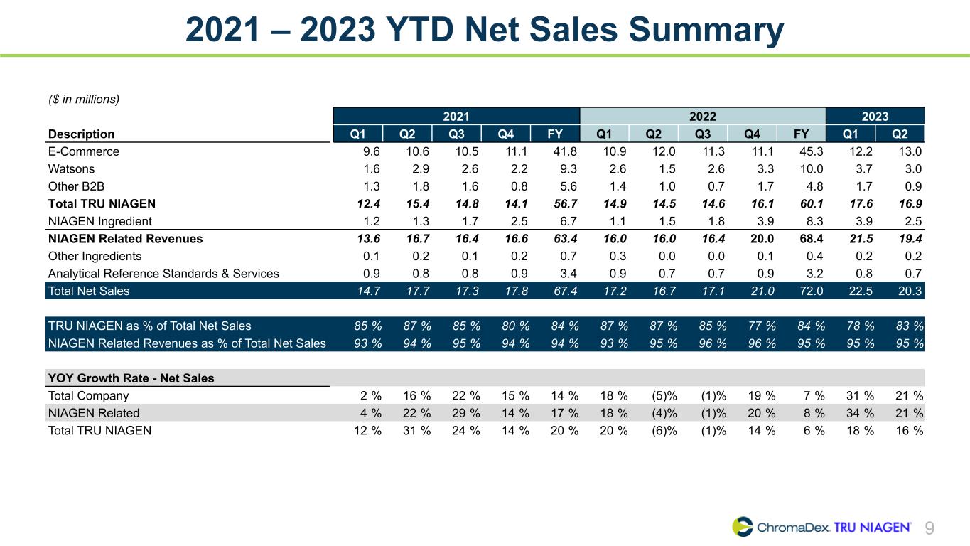 8 Strong growth in Niagen®-related business, up 28% year-over-year, driven by E-Commerce business, Watson’s sales and Niagen® ingredient sales. Year-to-Date 2023 Net Sales YTD 2023 Net Sales ($ in millions) Total +26% +10% +43% +148% (6)% +41% YoY % (vs YTD 2022) $34.5 25.2 9.3 6.4 1.5 0.4 E-Commerce Watson's & Other B2B Niagen® Ingredient Analytical Reference Standards & Services Other Ingredients