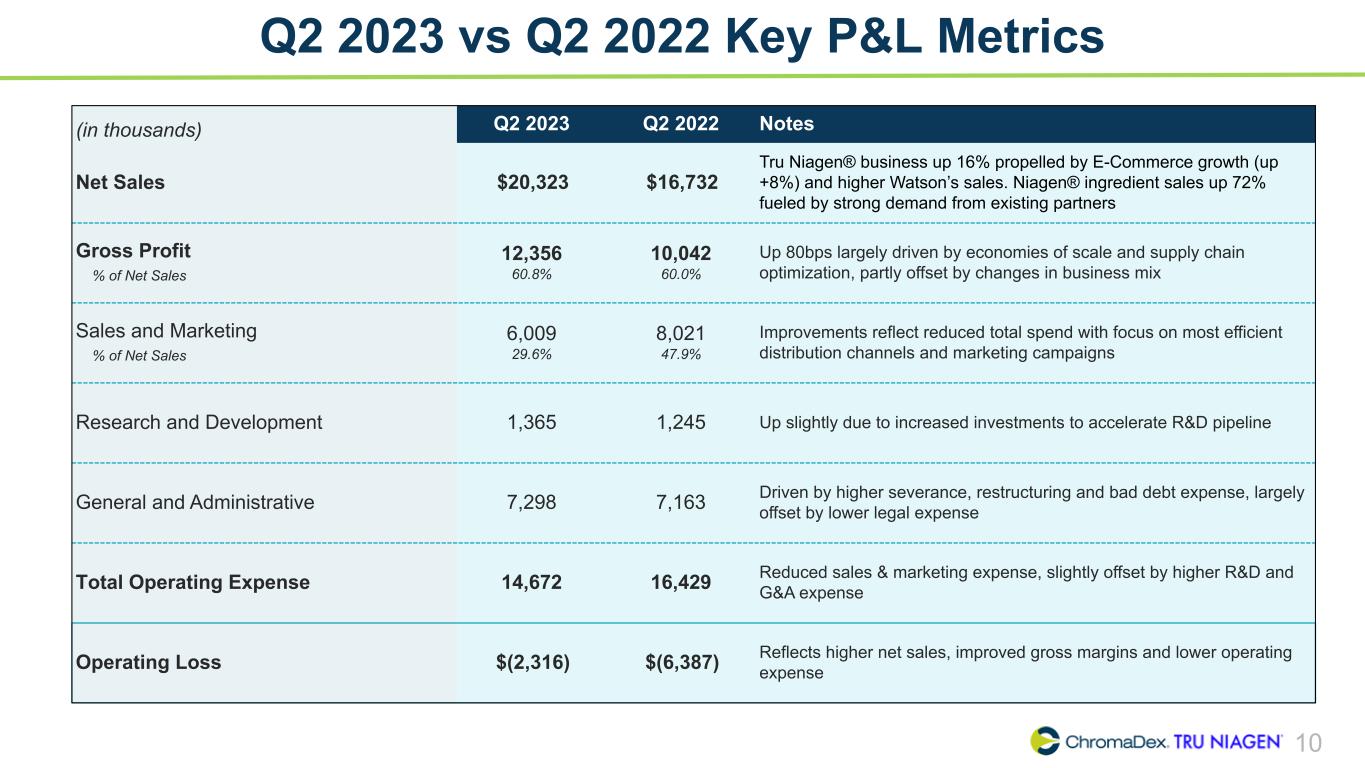 9 2021 – 2023 YTD Net Sales Summary ($ in millions) 2021 2022 2023 Description Q1 Q2 Q3 Q4 FY Q1 Q2 Q3 Q4 FY Q1 Q2 E-Commerce 9.6 10.6 10.5 11.1 41.8 10.9 12.0 11.3 11.1 45.3 12.2 13.0 Watsons 1.6 2.9 2.6 2.2 9.3 2.6 1.5 2.6 3.3 10.0 3.7 3.0 Other B2B 1.3 1.8 1.6 0.8 5.6 1.4 1.0 0.7 1.7 4.8 1.7 0.9 Total TRU NIAGEN 12.4 15.4 14.8 14.1 56.7 14.9 14.5 14.6 16.1 60.1 17.6 16.9 NIAGEN Ingredient 1.2 1.3 1.7 2.5 6.7 1.1 1.5 1.8 3.9 8.3 3.9 2.5 NIAGEN Related Revenues 13.6 16.7 16.4 16.6 63.4 16.0 16.0 16.4 20.0 68.4 21.5 19.4 Other Ingredients 0.1 0.2 0.1 0.2 0.7 0.3 0.0 0.0 0.1 0.4 0.2 0.2 Analytical Reference Standards & Services 0.9 0.8 0.8 0.9 3.4 0.9 0.7 0.7 0.9 3.2 0.8 0.7 Total Net Sales 14.7 17.7 17.3 17.8 67.4 17.2 16.7 17.1 21.0 72.0 22.5 20.3 TRU NIAGEN as % of Total Net Sales 85 % 87 % 85 % 80 % 84 % 87 % 87 % 85 % 77 % 84 % 78 % 83 % NIAGEN Related Revenues as % of Total Net Sales 93 % 94 % 95 % 94 % 94 % 93 % 95 % 96 % 96 % 95 % 95 % 95 % YOY Growth Rate - Net Sales Total Company 2 % 16 % 22 % 15 % 14 % 18 % (5) % (1) % 19 % 7 % 31 % 21 % NIAGEN Related 4 % 22 % 29 % 14 % 17 % 18 % (4) % (1) % 20 % 8 % 34 % 21 % Total TRU NIAGEN 12 % 31 % 24 % 14 % 20 % 20 % (6) % (1) % 14 % 6 % 18 % 16 %