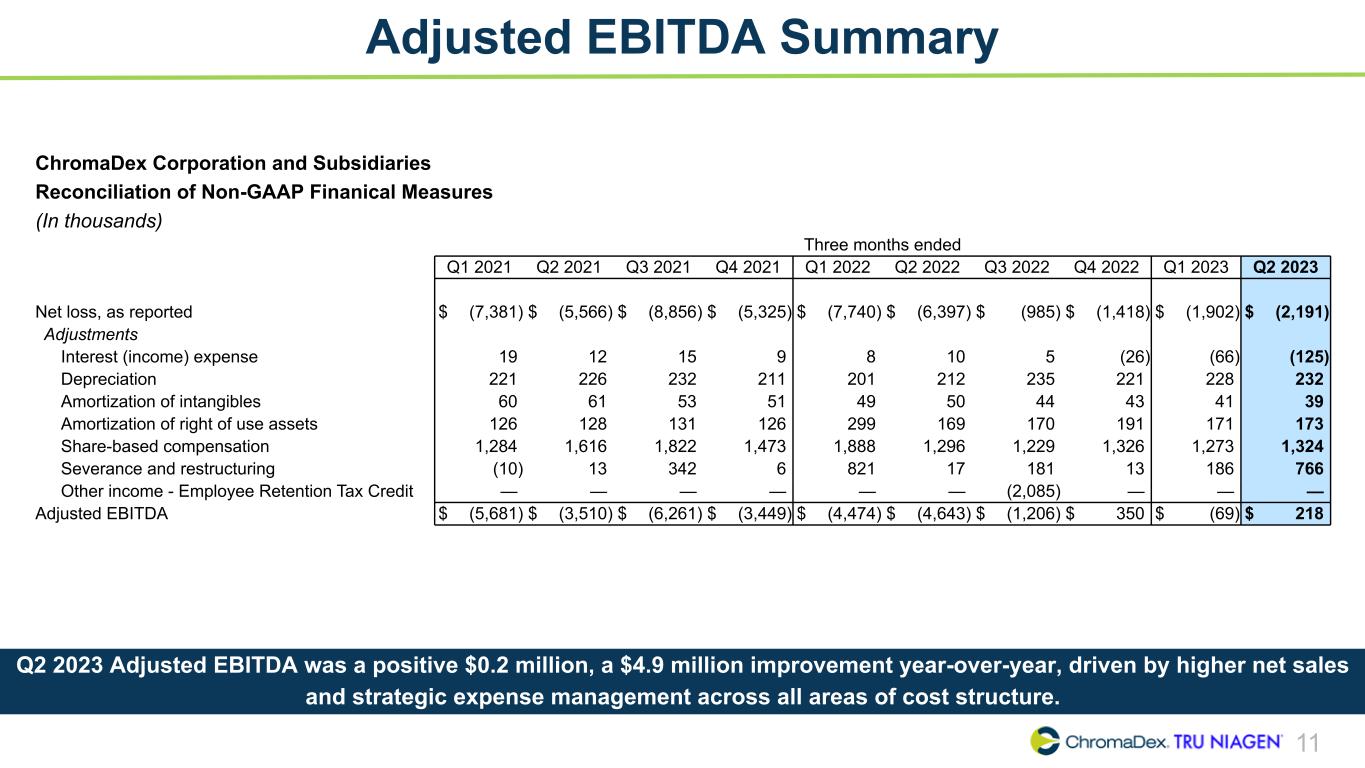 10 Q2 2023 vs Q2 2022 Key P&L Metrics (in thousands) Q2 2023 Q2 2022 Notes Net Sales $20,323 $16,732 Tru Niagen® business up 16% propelled by E-Commerce growth (up +8%) and higher Watson’s sales. Niagen® ingredient sales up 72% fueled by strong demand from existing partners Gross Profit % of Net Sales 12,356 60.8% 10,042 60.0% Up 80bps largely driven by economies of scale and supply chain optimization, partly offset by changes in business mix Sales and Marketing % of Net Sales 6,009 29.6% 8,021 47.9% Improvements reflect reduced total spend with focus on most efficient distribution channels and marketing campaigns Research and Development 1,365 1,245 Up slightly due to increased investments to accelerate R&D pipeline General and Administrative 7,298 7,163 Driven by higher severance, restructuring and bad debt expense, largely offset by lower legal expense Total Operating Expense 14,672 16,429 Reduced sales & marketing expense, slightly offset by higher R&D and G&A expense Operating Loss $(2,316) $(6,387) Reflects higher net sales, improved gross margins and lower operating expense