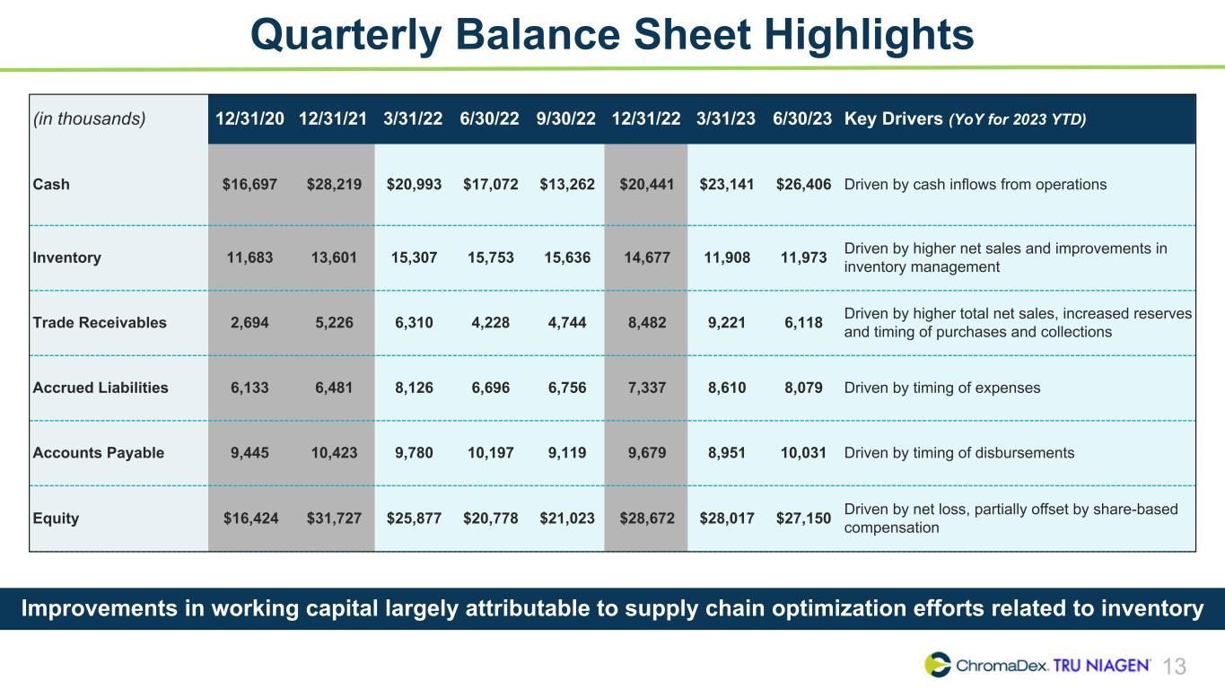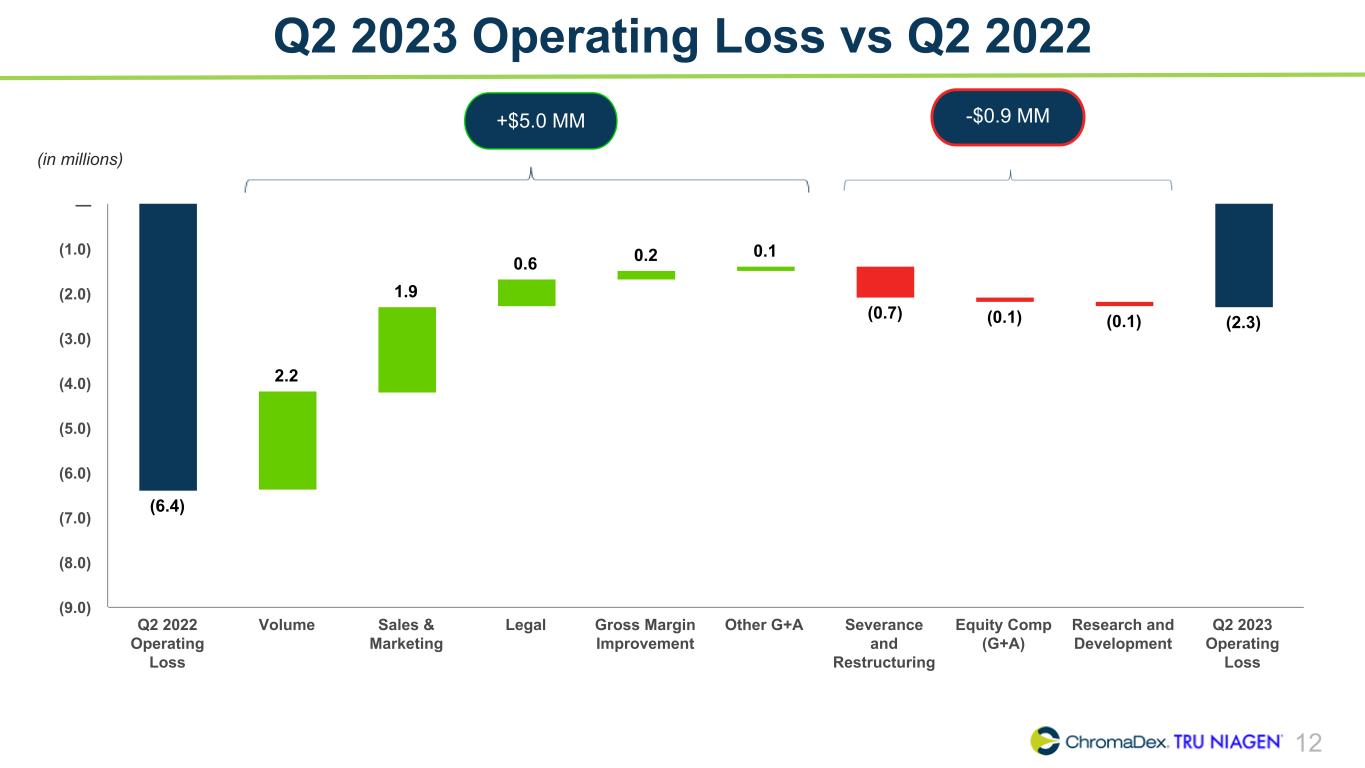 11 Adjusted EBITDA Summary ChromaDex Corporation and Subsidiaries Reconciliation of Non-GAAP Finanical Measures (In thousands) Three months ended Q1 2021 Q2 2021 Q3 2021 Q4 2021 Q1 2022 Q2 2022 Q3 2022 Q4 2022 Q1 2023 Q2 2023 Net loss, as reported $ (7,381) $ (5,566) $ (8,856) $ (5,325) $ (7,740) $ (6,397) $ (985) $ (1,418) $ (1,902) $ (2,191) Adjustments Interest (income) expense 19 12 15 9 8 10 5 (26) (66) (125) Depreciation 221 226 232 211 201 212 235 221 228 232 Amortization of intangibles 60 61 53 51 49 50 44 43 41 39 Amortization of right of use assets 126 128 131 126 299 169 170 191 171 173 Share-based compensation 1,284 1,616 1,822 1,473 1,888 1,296 1,229 1,326 1,273 1,324 Severance and restructuring (10) 13 342 6 821 17 181 13 186 766 Other income - Employee Retention Tax Credit — — — — — — (2,085) — — — Adjusted EBITDA $ (5,681) $ (3,510) $ (6,261) $ (3,449) $ (4,474) $ (4,643) $ (1,206) $ 350 $ (69) $ 218 Q2 2023 Adjusted EBITDA was a positive $0.2 million, a $4.9 million improvement year-over-year, driven by higher net sales and strategic expense management across all areas of cost structure.