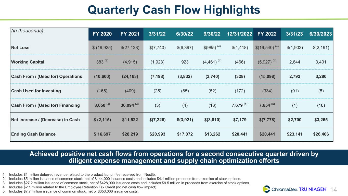 13 Quarterly Balance Sheet Highlights (in thousands) 12/31/20 12/31/21 3/31/22 6/30/22 9/30/22 12/31/22 3/31/23 6/30/23 Key Drivers (YoY for 2023 YTD) Cash $16,697 $28,219 $20,993 $17,072 $13,262 $20,441 $23,141 $26,406 Driven by cash inflows from operations Inventory 11,683 13,601 15,307 15,753 15,636 14,677 11,908 11,973 Driven by higher net sales and improvements in inventory management Trade Receivables 2,694 5,226 6,310 4,228 4,744 8,482 9,221 6,118 Driven by higher total net sales, increased reserves and timing of purchases and collections Accrued Liabilities 6,133 6,481 8,126 6,696 6,756 7,337 8,610 8,079 Driven by timing of expenses Accounts Payable 9,445 10,423 9,780 10,197 9,119 9,679 8,951 10,031 Driven by timing of disbursements Equity $16,424 $31,727 $25,877 $20,778 $21,023 $28,672 $28,017 $27,150 Driven by net loss, partially offset by share-based compensation Improvements in working capital largely attributable to supply chain optimization efforts related to inventory