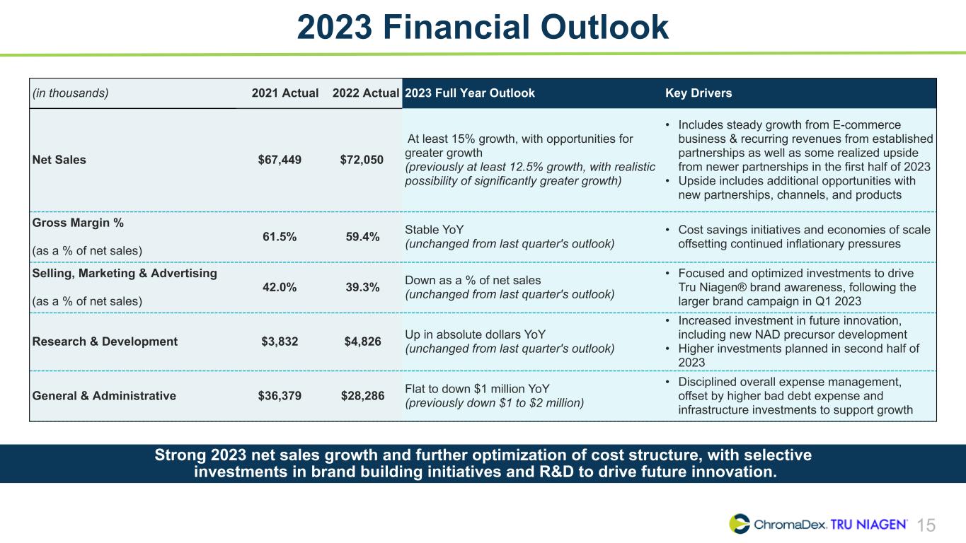 14 Quarterly Cash Flow Highlights Achieved positive net cash flows from operations for a second consecutive quarter driven by diligent expense management and supply chain optimization efforts (in thousands) FY 2020 FY 2021 3/31/22 6/30/22 9/30/22 12/31/2022 FY 2022 3/31/23 6/30/2023 Net Loss $ (19,925) $(27,128) $(7,740) $(6,397) $(985) (4) $(1,418) $(16,540) (4) $(1,902) $(2,191) Working Capital 383 (1) (4,915) (1,923) 923 (4,461) (4) (466) (5,927) (4) 2,644 3,401 Cash From / (Used for) Operations (10,600) (24,163) (7,198) (3,832) (3,740) (328) (15,098) 2,792 3,280 Cash Used for Investing (165) (409) (25) (85) (52) (172) (334) (91) (5) Cash From / (Used for) Financing 8,650 (2) 36,094 (3) (3) (4) (18) 7,679 (5) 7,654 (5) (1) (10) Net Increase / (Decrease) in Cash $ (2,115) $11,522 $(7,226) $(3,921) $(3,810) $7,179 $(7,778) $2,700 $3,265 Ending Cash Balance $ 16,697 $28,219 $20,993 $17,072 $13,262 $20,441 $20,441 $23,141 $26,406 1. Includes $1 million deferred revenue related to the product launch fee received from Nestlé. 2. Includes $5 million issuance of common stock, net of $144,000 issuance costs and includes $4.1 million proceeds from exercise of stock options. 3. Includes $27.2 million issuance of common stock, net of $428,000 issuance costs and includes $9.5 million in proceeds from exercise of stock options. 4. Includes $2.1 million related to the Employee Retention Tax Credit (no net cash flow impact). 5. Includes $7.7 million issuance of common stock, net of $353,000 issuance costs.