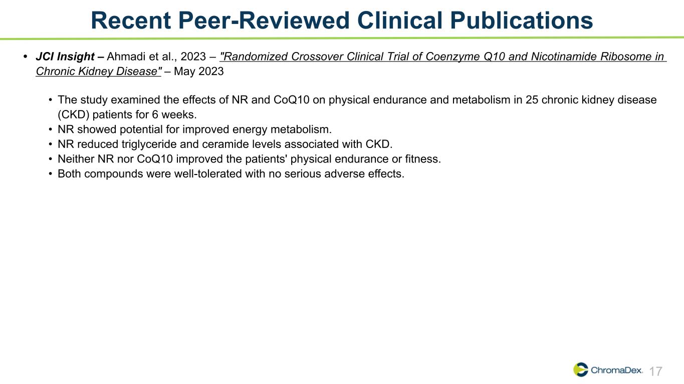 17 Recent Peer-Reviewed Clinical Publications • JCI Insight – Ahmadi et al., 2023 – "Randomized Crossover Clinical Trial of Coenzyme Q10 and Nicotinamide Ribosome in Chronic Kidney Disease" – May 2023 • The study examined the effects of NR and CoQ10 on physical endurance and metabolism in 25 chronic kidney disease (CKD) patients for 6 weeks. • NR showed potential for improved energy metabolism. • NR reduced triglyceride and ceramide levels associated with CKD. • Neither NR nor CoQ10 improved the patients' physical endurance or fitness. • Both compounds were well-tolerated with no serious adverse effects.