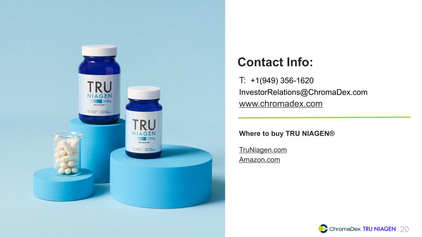 The information contained in this documents is confidential, privileged and only for the information of the intended recipient and may not be used, published or redistributed without the prior written consent (2019) Contact Info: T: +1(949) 356-1620 InvestorRelations@ChromaDex.com www.chromadex.com Where to buy TRU NIAGEN® TruNiagen.com Amazon.com 20