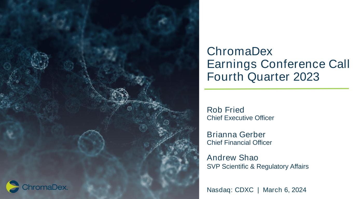 ChromaDex Earnings Conference Call Fourth Quarter 2023 Rob Fried Chief Executive Officer Brianna Gerber Chief Financial Officer Andrew Shao SVP Scientific & Regulatory Affairs Nasdaq: CDXC | March 6, 2024