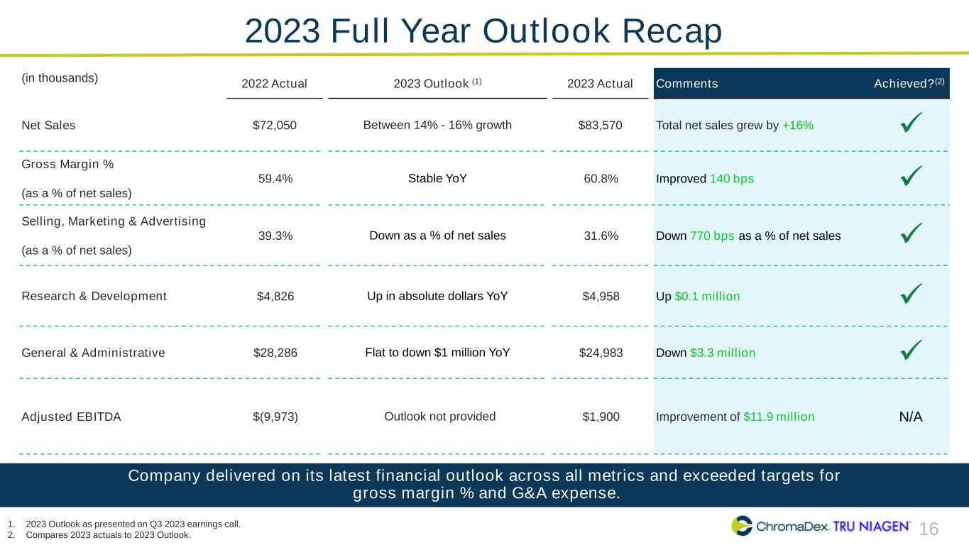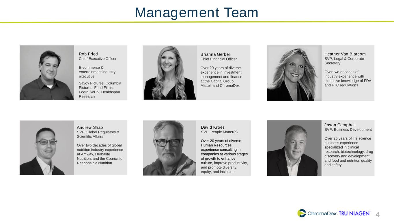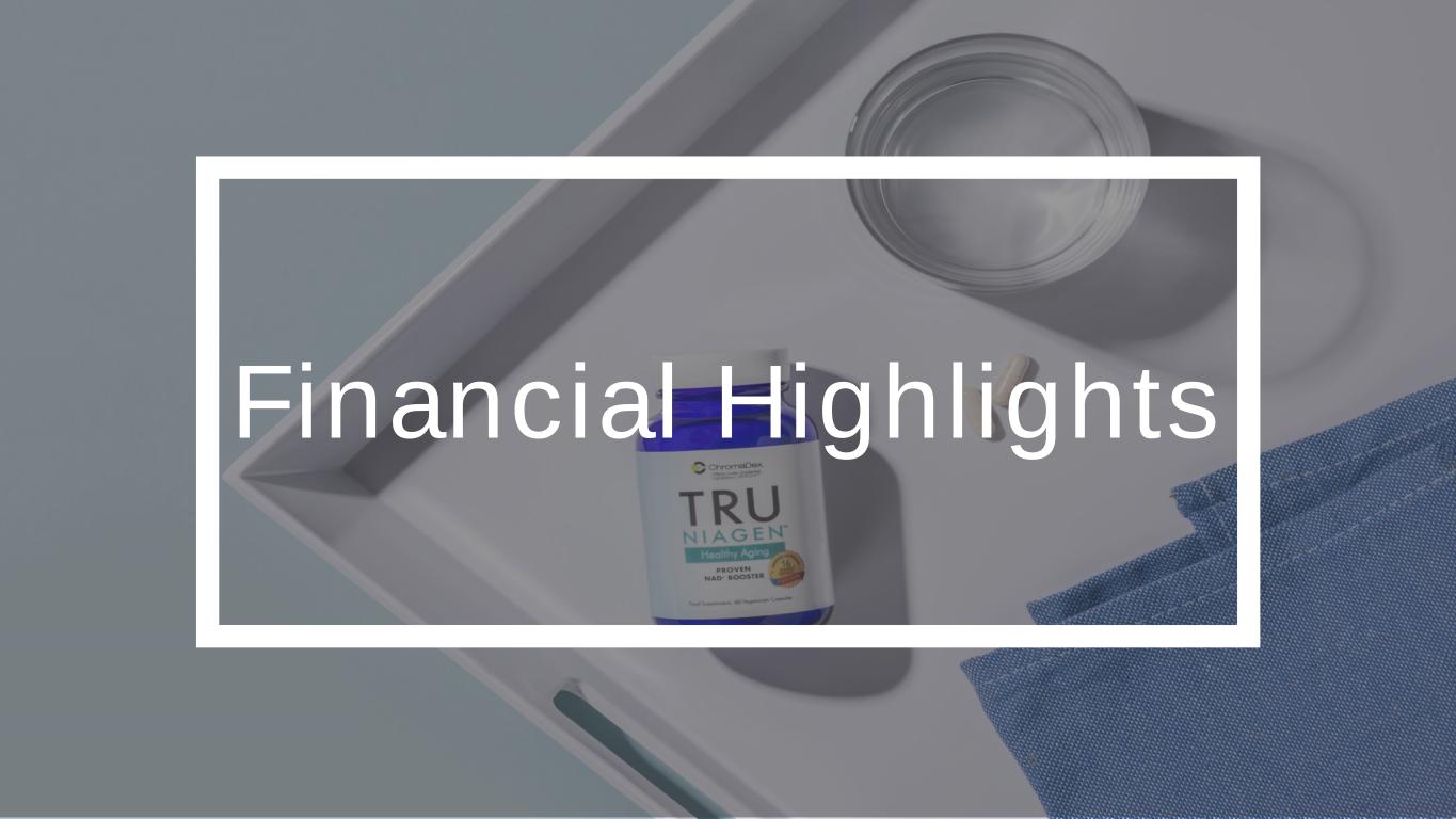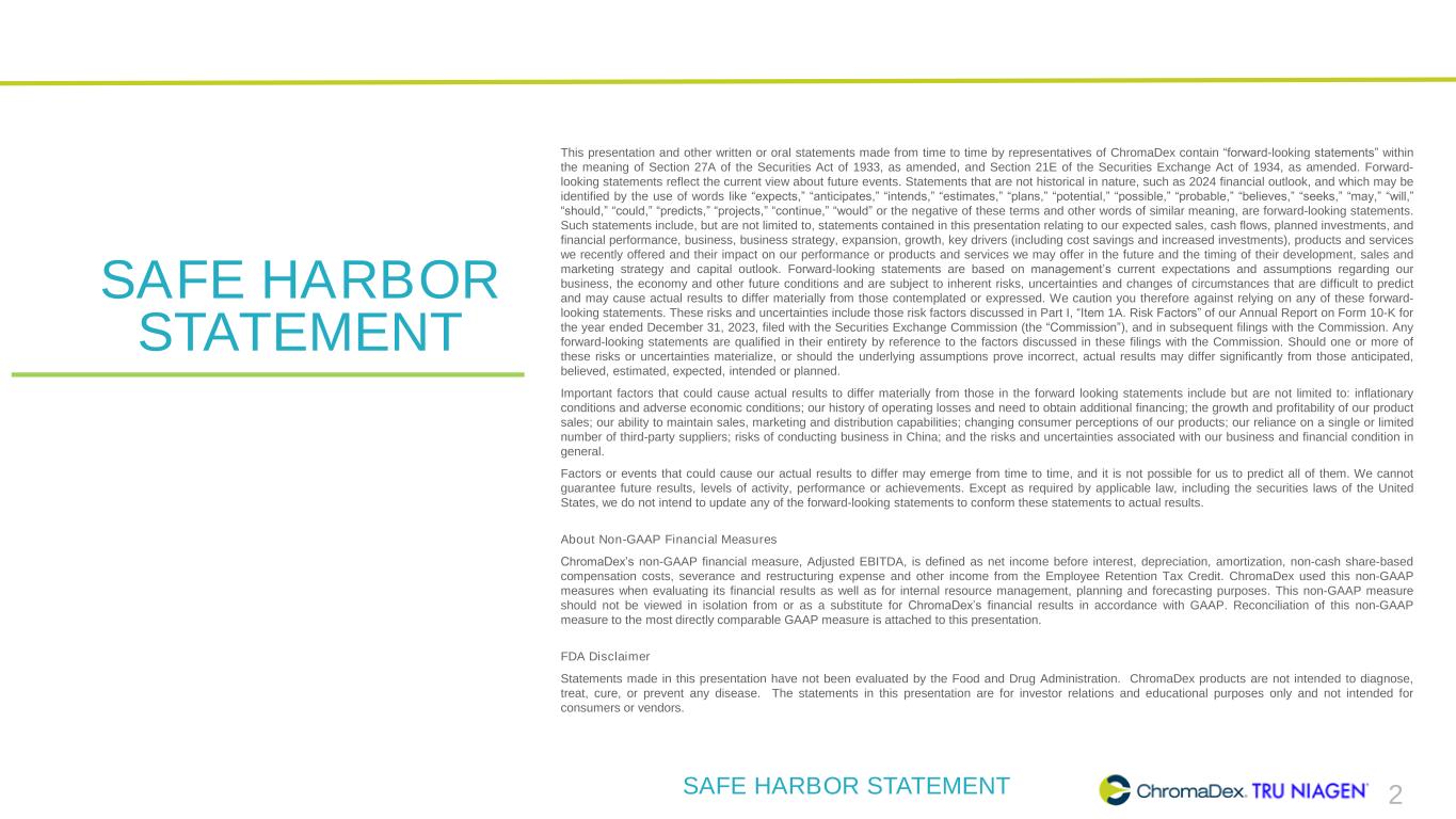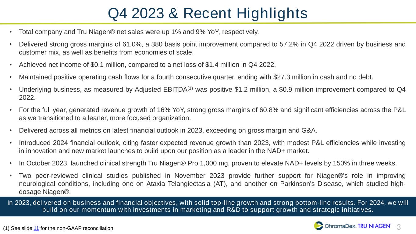 2 SAFE HARBOR STATEMENT This presentation and other written or oral statements made from time to time by representatives of ChromaDex contain “forward-looking statements” within the meaning of Section 27A of the Securities Act of 1933, as amended, and Section 21E of the Securities Exchange Act of 1934, as amended. Forward- looking statements reflect the current view about future events. Statements that are not historical in nature, such as 2024 financial outlook, and which may be identified by the use of words like “expects,” “anticipates,” “intends,” “estimates,” “plans,” “potential,” “possible,” “probable,” “believes,” “seeks,” “may,” “will,” “should,” “could,” “predicts,” “projects,” “continue,” “would” or the negative of these terms and other words of similar meaning, are forward-looking statements. Such statements include, but are not limited to, statements contained in this presentation relating to our expected sales, cash flows, planned investments, and financial performance, business, business strategy, expansion, growth, key drivers (including cost savings and increased investments), products and services we recently offered and their impact on our performance or products and services we may offer in the future and the timing of their development, sales and marketing strategy and capital outlook. Forward-looking statements are based on management’s current expectations and assumptions regarding our business, the economy and other future conditions and are subject to inherent risks, uncertainties and changes of circumstances that are difficult to predict and may cause actual results to differ materially from those contemplated or expressed. We caution you therefore against relying on any of these forward- looking statements. These risks and uncertainties include those risk factors discussed in Part I, “Item 1A. Risk Factors” of our Annual Report on Form 10-K for the year ended December 31, 2023, filed with the Securities Exchange Commission (the “Commission”), and in subsequent filings with the Commission. Any forward-looking statements are qualified in their entirety by reference to the factors discussed in these filings with the Commission. Should one or more of these risks or uncertainties materialize, or should the underlying assumptions prove incorrect, actual results may differ significantly from those anticipated, believed, estimated, expected, intended or planned. Important factors that could cause actual results to differ materially from those in the forward looking statements include but are not limited to: inflationary conditions and adverse economic conditions; our history of operating losses and need to obtain additional financing; the growth and profitability of our product sales; our ability to maintain sales, marketing and distribution capabilities; changing consumer perceptions of our products; our reliance on a single or limited number of third-party suppliers; risks of conducting business in China; and the risks and uncertainties associated with our business and financial condition in general. Factors or events that could cause our actual results to differ may emerge from time to time, and it is not possible for us to predict all of them. We cannot guarantee future results, levels of activity, performance or achievements. Except as required by applicable law, including the securities laws of the United States, we do not intend to update any of the forward-looking statements to conform these statements to actual results. About Non-GAAP Financial Measures ChromaDex’s non-GAAP financial measure, Adjusted EBITDA, is defined as net income before interest, depreciation, amortization, non-cash share-based compensation costs, severance and restructuring expense and other income from the Employee Retention Tax Credit. ChromaDex used this non-GAAP measures when evaluating its financial results as well as for internal resource management, planning and forecasting purposes. This non-GAAP measure should not be viewed in isolation from or as a substitute for ChromaDex’s financial results in accordance with GAAP. Reconciliation of this non-GAAP measure to the most directly comparable GAAP measure is attached to this presentation. FDA Disclaimer Statements made in this presentation have not been evaluated by the Food and Drug Administration. ChromaDex products are not intended to diagnose, treat, cure, or prevent any disease. The statements in this presentation are for investor relations and educational purposes only and not intended for consumers or vendors. SAFE HARBOR STATEMENT