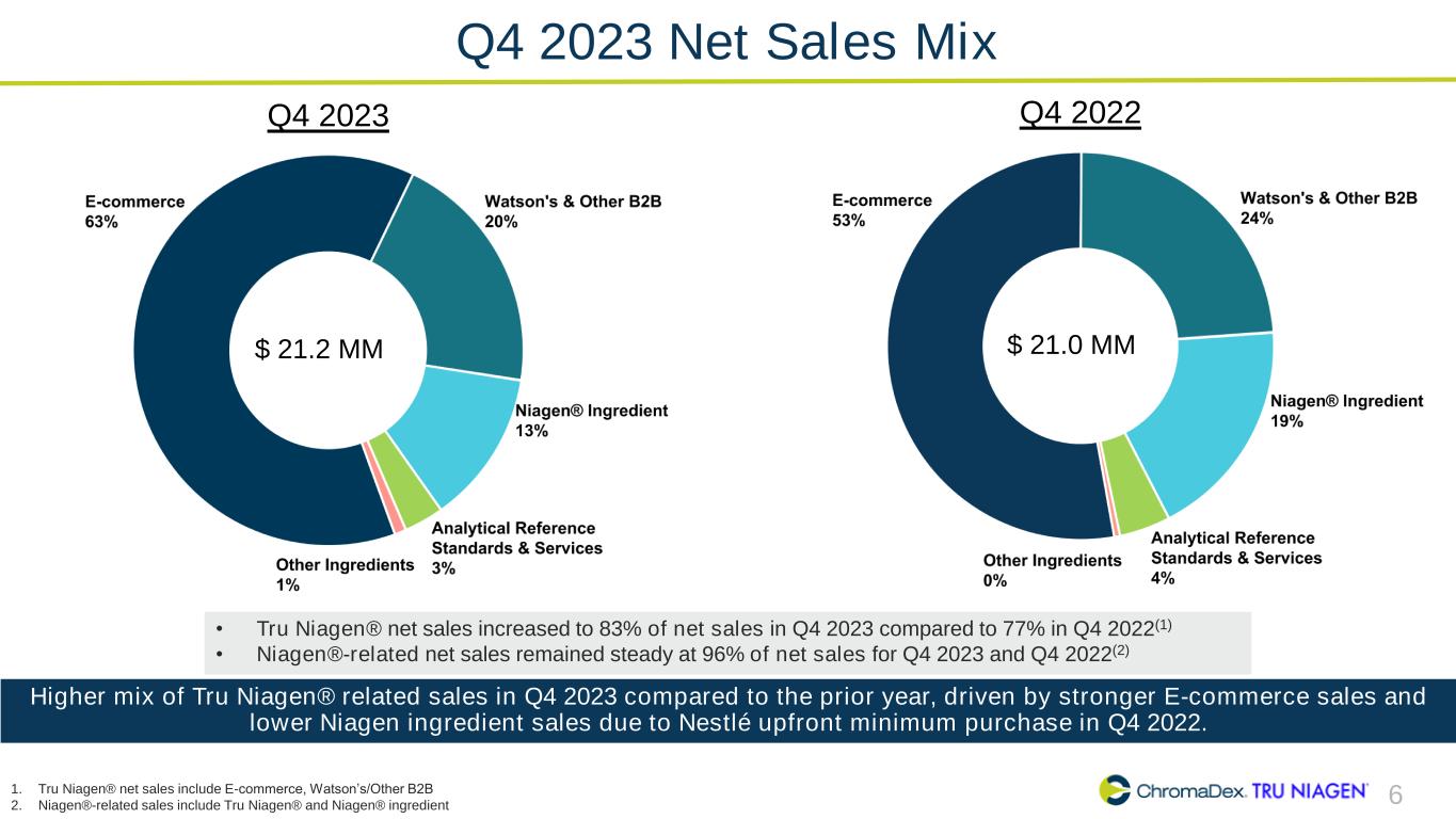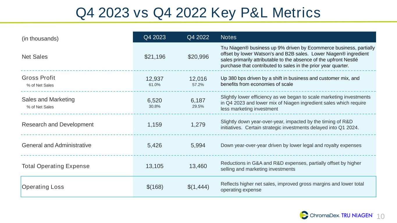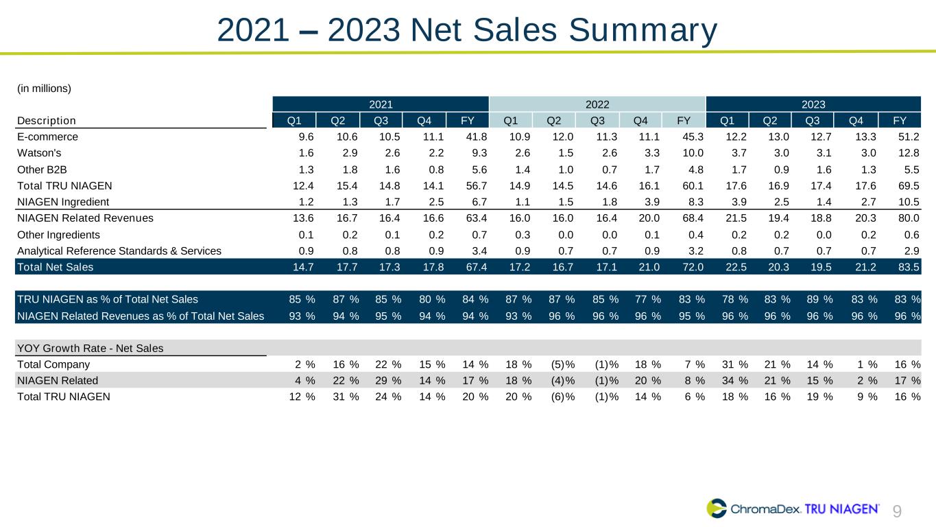 9 2021 – 2023 Net Sales Summary (in millions) 2021 2022 2023 Description Q1 Q2 Q3 Q4 FY Q1 Q2 Q3 Q4 FY Q1 Q2 Q3 Q4 FY E-commerce 9.6 10.6 10.5 11.1 41.8 10.9 12.0 11.3 11.1 45.3 12.2 13.0 12.7 13.3 51.2 Watson's 1.6 2.9 2.6 2.2 9.3 2.6 1.5 2.6 3.3 10.0 3.7 3.0 3.1 3.0 12.8 Other B2B 1.3 1.8 1.6 0.8 5.6 1.4 1.0 0.7 1.7 4.8 1.7 0.9 1.6 1.3 5.5 Total TRU NIAGEN 12.4 15.4 14.8 14.1 56.7 14.9 14.5 14.6 16.1 60.1 17.6 16.9 17.4 17.6 69.5 NIAGEN Ingredient 1.2 1.3 1.7 2.5 6.7 1.1 1.5 1.8 3.9 8.3 3.9 2.5 1.4 2.7 10.5 NIAGEN Related Revenues 13.6 16.7 16.4 16.6 63.4 16.0 16.0 16.4 20.0 68.4 21.5 19.4 18.8 20.3 80.0 Other Ingredients 0.1 0.2 0.1 0.2 0.7 0.3 0.0 0.0 0.1 0.4 0.2 0.2 0.0 0.2 0.6 Analytical Reference Standards & Services 0.9 0.8 0.8 0.9 3.4 0.9 0.7 0.7 0.9 3.2 0.8 0.7 0.7 0.7 2.9 Total Net Sales 14.7 17.7 17.3 17.8 67.4 17.2 16.7 17.1 21.0 72.0 22.5 20.3 19.5 21.2 83.5 TRU NIAGEN as % of Total Net Sales 85 % 87 % 85 % 80 % 84 % 87 % 87 % 85 % 77 % 83 % 78 % 83 % 89 % 83 % 83 % NIAGEN Related Revenues as % of Total Net Sales 93 % 94 % 95 % 94 % 94 % 93 % 96 % 96 % 96 % 95 % 96 % 96 % 96 % 96 % 96 % YOY Growth Rate - Net Sales Total Company 2 % 16 % 22 % 15 % 14 % 18 % (5)% (1)% 18 % 7 % 31 % 21 % 14 % 1 % 16 % NIAGEN Related 4 % 22 % 29 % 14 % 17 % 18 % (4)% (1)% 20 % 8 % 34 % 21 % 15 % 2 % 17 % Total TRU NIAGEN 12 % 31 % 24 % 14 % 20 % 20 % (6)% (1)% 14 % 6 % 18 % 16 % 19 % 9 % 16 %