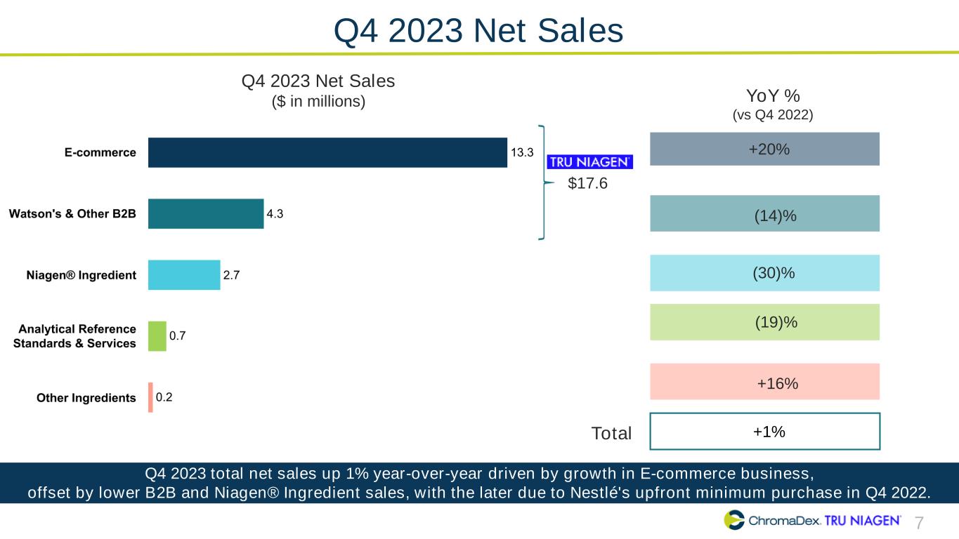 6 Q4 2023 Net Sales Mix Q4 2022Q4 2023 • Tru Niagen® net sales increased to 83% of net sales in Q4 2023 compared to 77% in Q4 2022(1) • Niagen®-related net sales remained steady at 96% of net sales for Q4 2023 and Q4 2022(2) $ 21.2 MM Higher mix of Tru Niagen® related sales in Q4 2023 compared to the prior year, driven by stronger E-commerce sales and lower Niagen ingredient sales due to Nestlé upfront minimum purchase in Q4 2022. 1. Tru Niagen® net sales include E-commerce, Watson’s/Other B2B 2. Niagen®-related sales include Tru Niagen® and Niagen® ingredient $ 21.0 MM