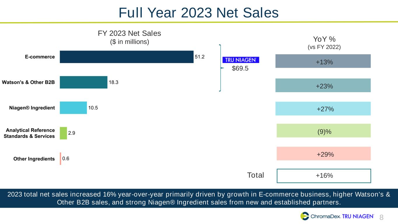7 Q4 2023 Net Sales Q4 2023 Net Sales ($ in millions) $17.6 Q4 2023 total net sales up 1% year-over-year driven by growth in E-commerce business, offset by lower B2B and Niagen® Ingredient sales, with the later due to Nestlé's upfront minimum purchase in Q4 2022. YoY % (vs Q4 2022) +20% (14)% (30)% (19)% +16% +1%Total