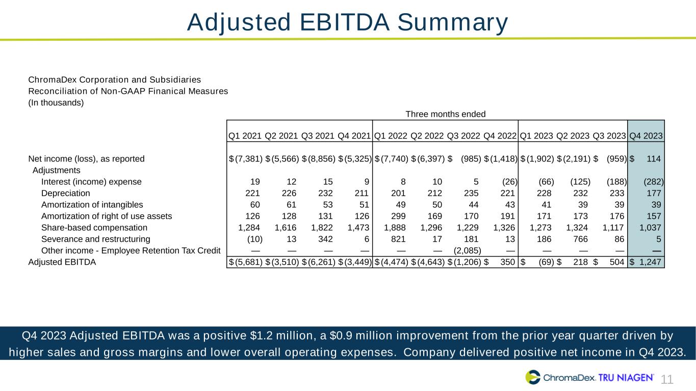 10 Q4 2023 vs Q4 2022 Key P&L Metrics (in thousands) Q4 2023 Q4 2022 Notes Net Sales $21,196 $20,996 Tru Niagen® business up 9% driven by Ecommerce business, partially offset by lower Watson's and B2B sales. Lower Niagen® ingredient sales primarily attributable to the absence of the upfront Nestlé purchase that contributed to sales in the prior year quarter. Gross Profit % of Net Sales 12,937 61.0% 12,016 57.2% Up 380 bps driven by a shift in business and customer mix, and benefits from economies of scale Sales and Marketing % of Net Sales 6,520 30.8% 6,187 29.5% Slightly lower efficiency as we began to scale marketing investments in Q4 2023 and lower mix of Niagen ingredient sales which require less marketing investment Research and Development 1,159 1,279 Slightly down year-over-year, impacted by the timing of R&D initiatives. Certain strategic investments delayed into Q1 2024. General and Administrative 5,426 5,994 Down year-over-year driven by lower legal and royalty expenses Total Operating Expense 13,105 13,460 Reductions in G&A and R&D expenses, partially offset by higher selling and marketing investments Operating Loss $(168) $(1,444) Reflects higher net sales, improved gross margins and lower total operating expense