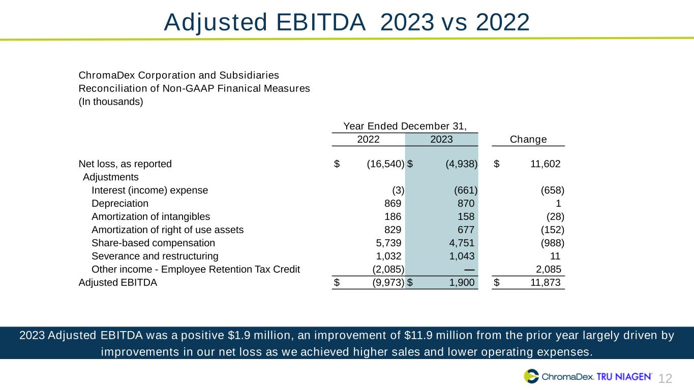 11 Adjusted EBITDA Summary ChromaDex Corporation and Subsidiaries Reconciliation of Non-GAAP Finanical Measures (In thousands) Three months ended Q1 2021 Q2 2021 Q3 2021 Q4 2021 Q1 2022 Q2 2022 Q3 2022 Q4 2022 Q1 2023 Q2 2023 Q3 2023 Q4 2023 Net income (loss), as reported $ (7,381) $ (5,566) $ (8,856) $ (5,325) $ (7,740) $ (6,397) $ (985) $ (1,418) $ (1,902) $ (2,191) $ (959) $ 114 Adjustments Interest (income) expense 19 12 15 9 8 10 5 (26) (66) (125) (188) (282) Depreciation 221 226 232 211 201 212 235 221 228 232 233 177 Amortization of intangibles 60 61 53 51 49 50 44 43 41 39 39 39 Amortization of right of use assets 126 128 131 126 299 169 170 191 171 173 176 157 Share-based compensation 1,284 1,616 1,822 1,473 1,888 1,296 1,229 1,326 1,273 1,324 1,117 1,037 Severance and restructuring (10) 13 342 6 821 17 181 13 186 766 86 5 Other income - Employee Retention Tax Credit — — — — — — (2,085) — — — — — Adjusted EBITDA $ (5,681) $ (3,510) $ (6,261) $ (3,449) $ (4,474) $ (4,643) $ (1,206) $ 350 $ (69) $ 218 $ 504 $ 1,247 Q4 2023 Adjusted EBITDA was a positive $1.2 million, a $0.9 million improvement from the prior year quarter driven by higher sales and gross margins and lower overall operating expenses. Company delivered positive net income in Q4 2023.