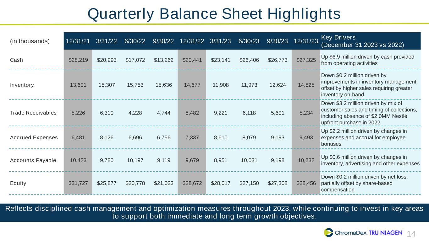 12 Adjusted EBITDA 2023 vs 2022 ChromaDex Corporation and Subsidiaries Reconciliation of Non-GAAP Finanical Measures (In thousands) Year Ended December 31, Change2022 2023 Net loss, as reported $ (16,540) $ (4,938) $ 11,602 Adjustments Interest (income) expense (3) (661) (658) Depreciation 869 870 1 Amortization of intangibles 186 158 (28) Amortization of right of use assets 829 677 (152) Share-based compensation 5,739 4,751 (988) Severance and restructuring 1,032 1,043 11 Other income - Employee Retention Tax Credit (2,085) — 2,085 Adjusted EBITDA $ (9,973) $ 1,900 $ 11,873 2023 Adjusted EBITDA was a positive $1.9 million, an improvement of $11.9 million from the prior year largely driven by improvements in our net loss as we achieved higher sales and lower operating expenses.